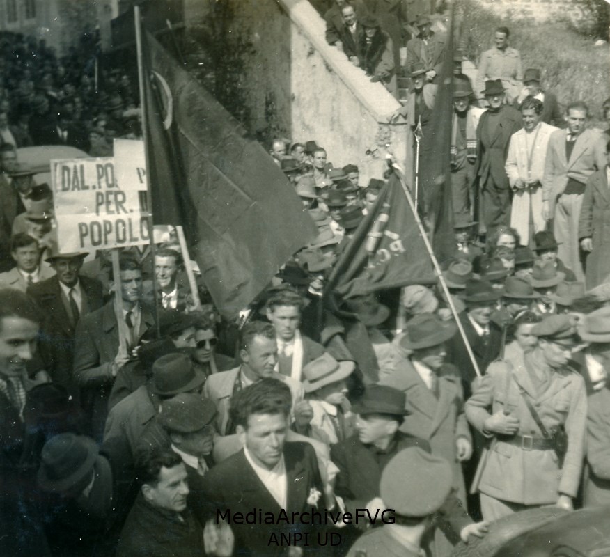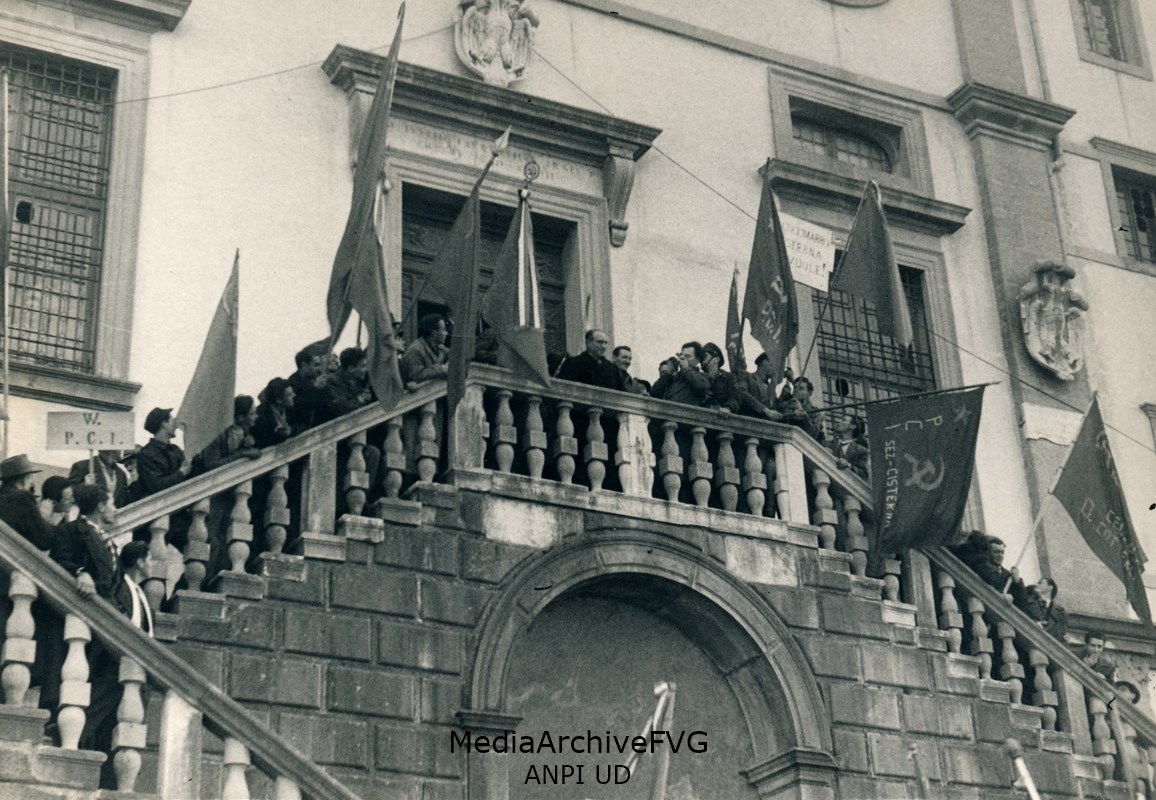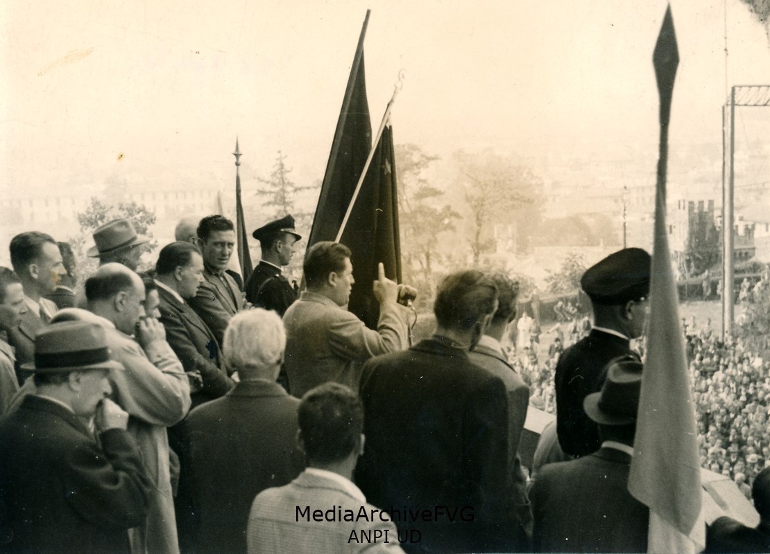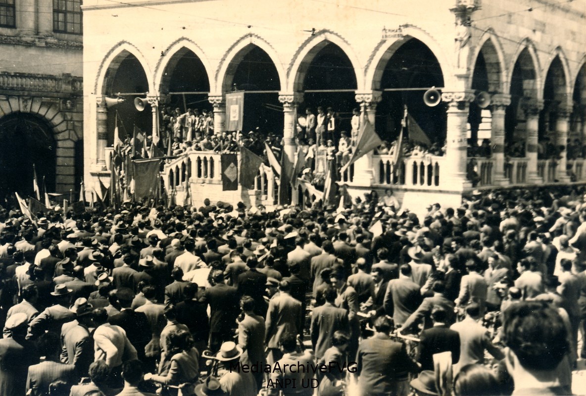 Manifestazione in occasione delle celebrazioni per il 25 aprile. Al microfono parla Amerigo Cloccchiatti. Si riconoscono: Giovanni Cosattini, Gino Lizzero “Ettore”, Gino Beltrame, Tita Angeli e Umberto Zanfagnini “Daniele”