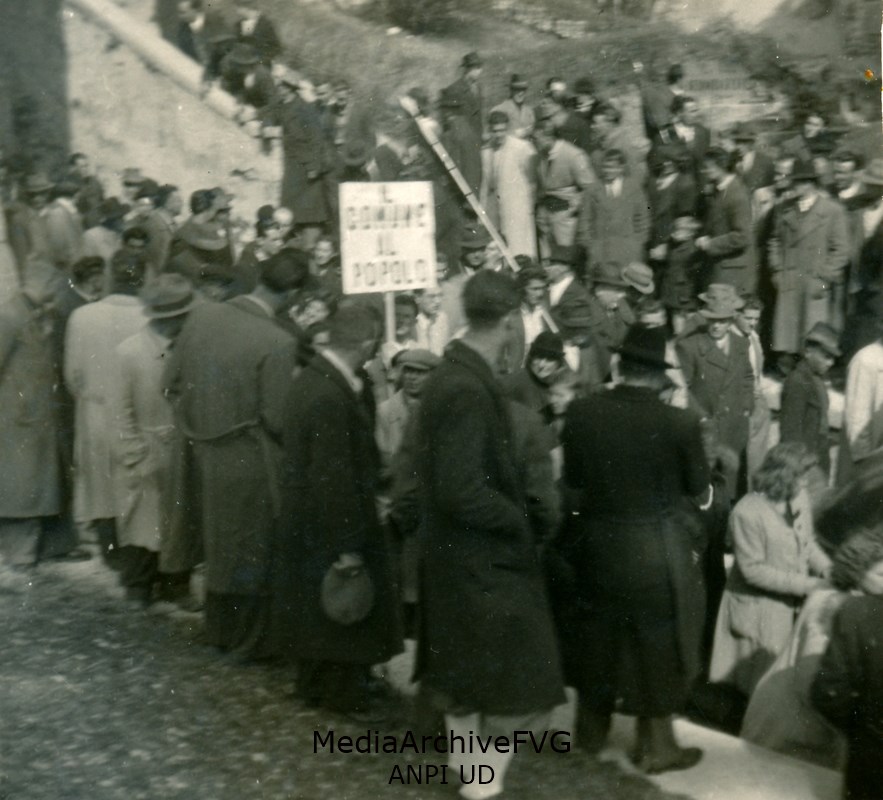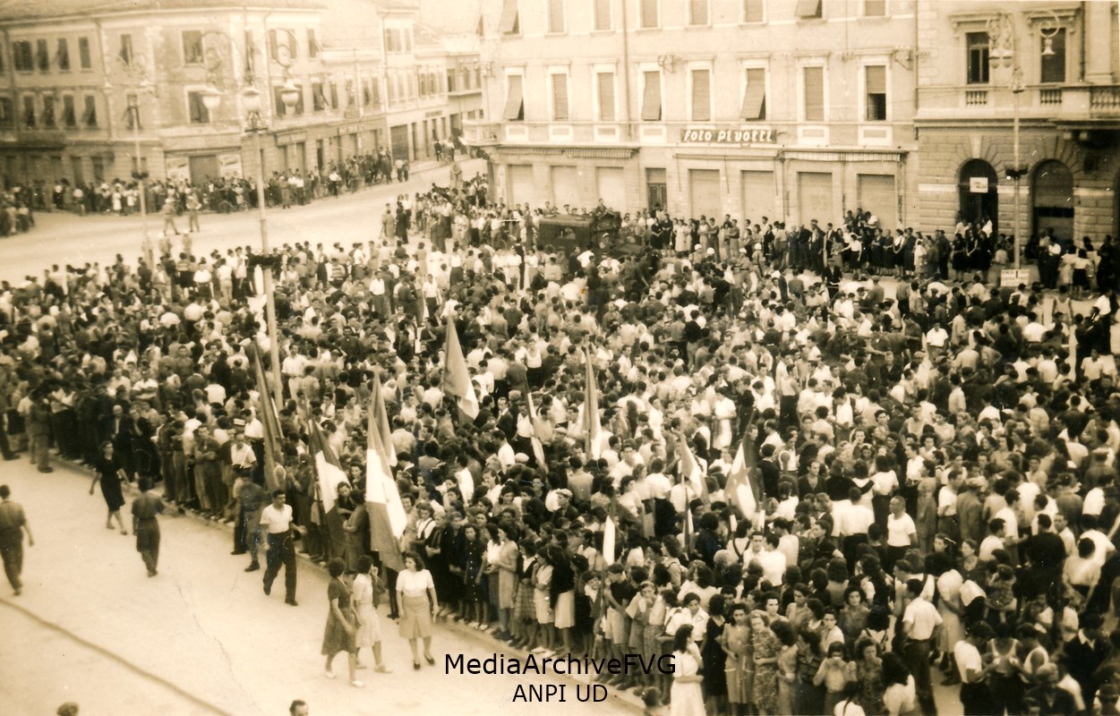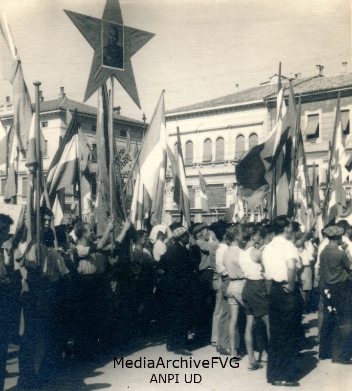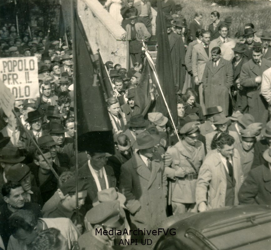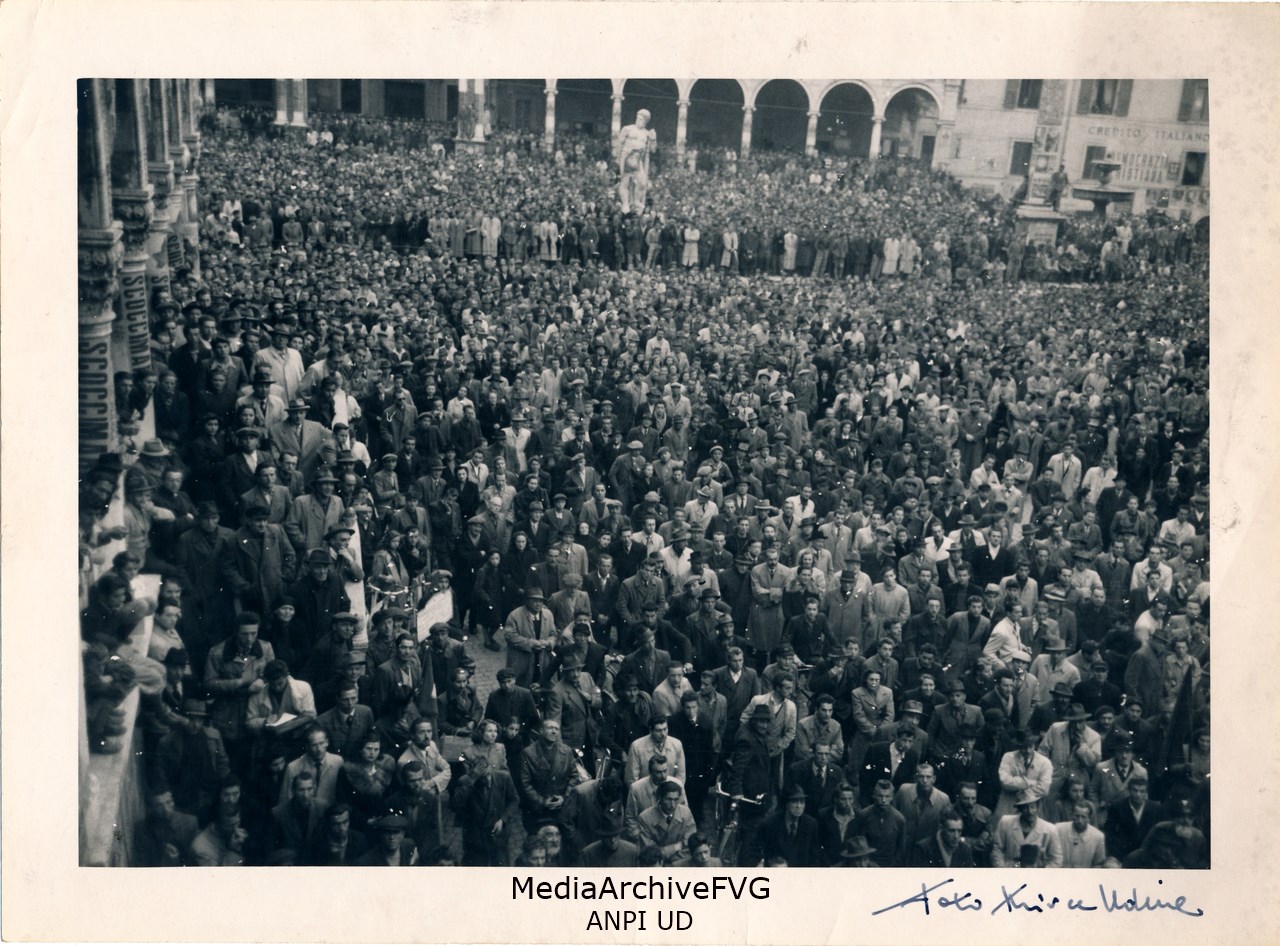 Manifestazione in occasione delle celebrazioni per il 25 aprile. Al microfono parla Amerigo Cloccchiatti. Si riconoscono: Giovanni Cosattini, Gino Lizzero “Ettore”, Gino Beltrame, Tita Angeli e Umberto Zanfagnini “Daniele”