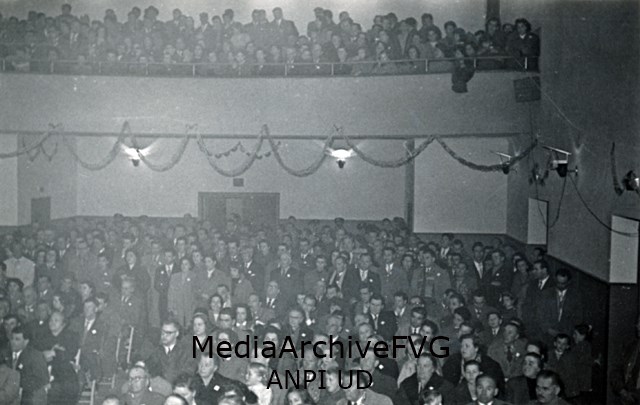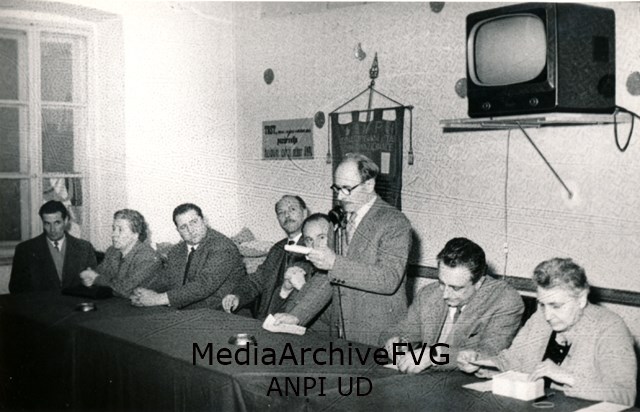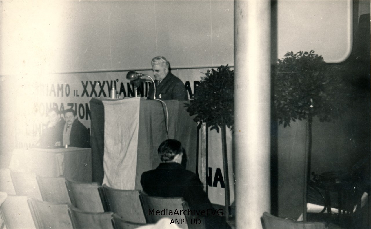 Giuseppe Dozza, sindaco di Bologna, al microfono durante le celebrazioni per il XXXVI anniversario dellaFondazione del Partito Comunista; al tavolo dei relatori è presente anche Mario Lizzero “Andrea”