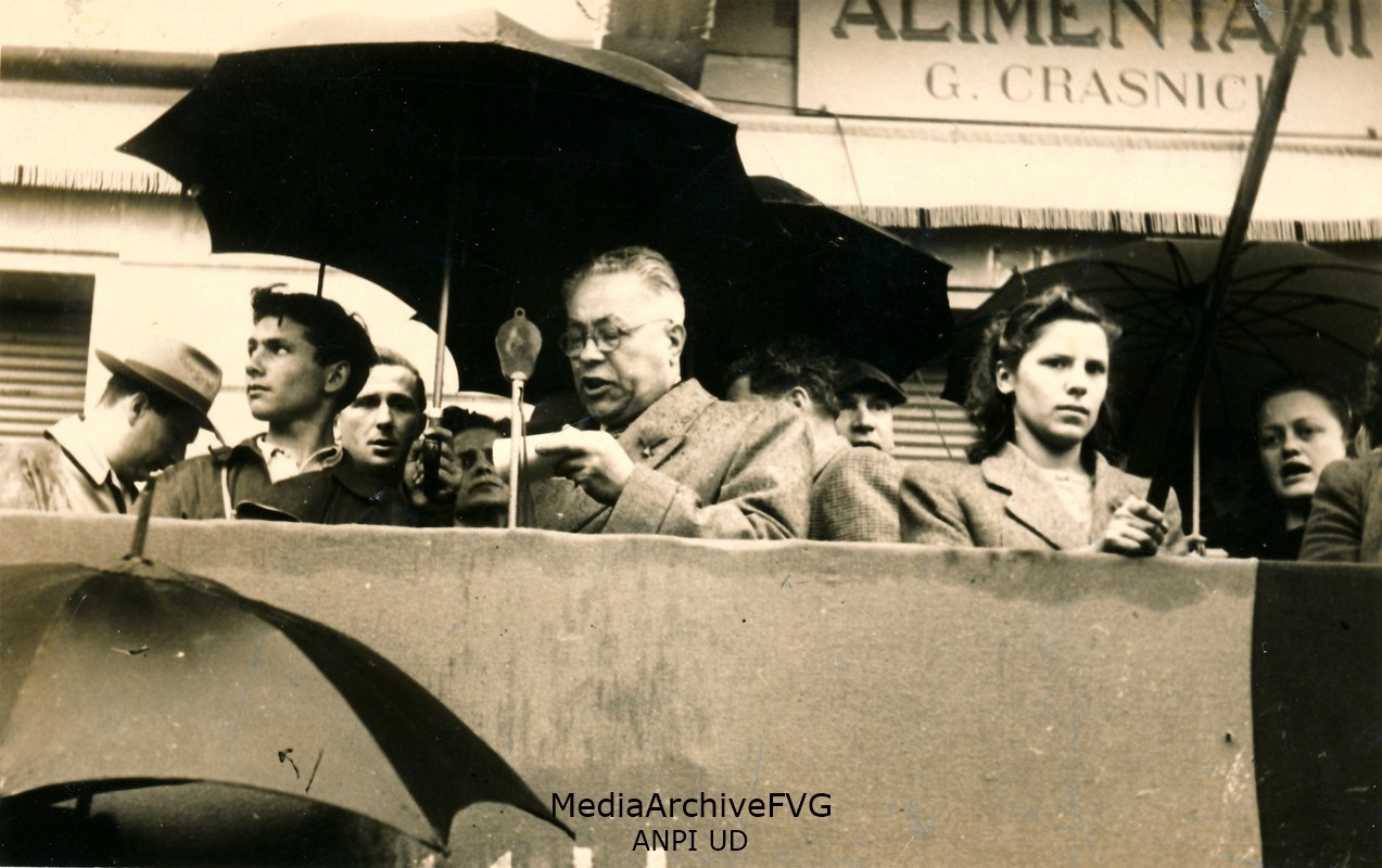 Severino Bolognesi, deputato comunista all'Assemblea Costituente al microfono durante una manifestazione; si riconosce anche Gino Beltrame