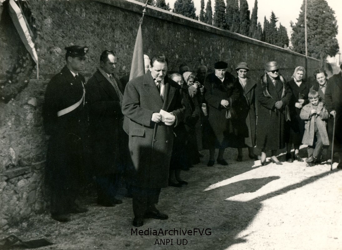 Mario Lizzero “Andrea” durante la cerimonia di commemorazione dei 23 partigiani osovani e garibaldini fucilati davanti al cimitero di Udine l'11 febbraio 1945