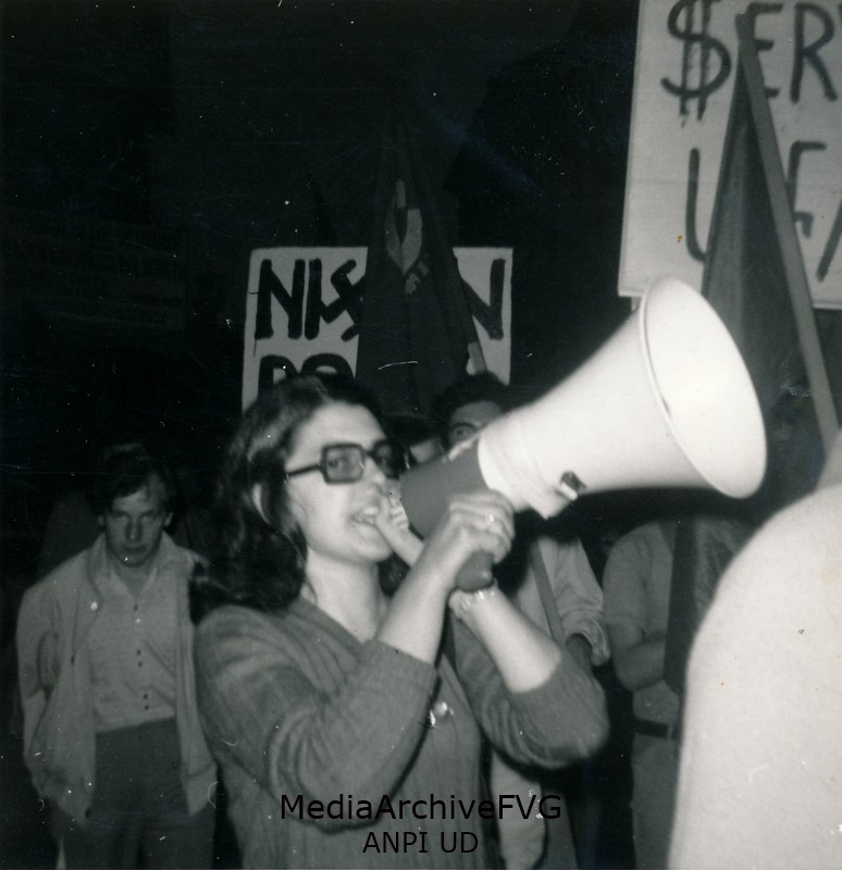 Una manifestante col megafono; in secondo piano si intravedono cartelli antiamericani