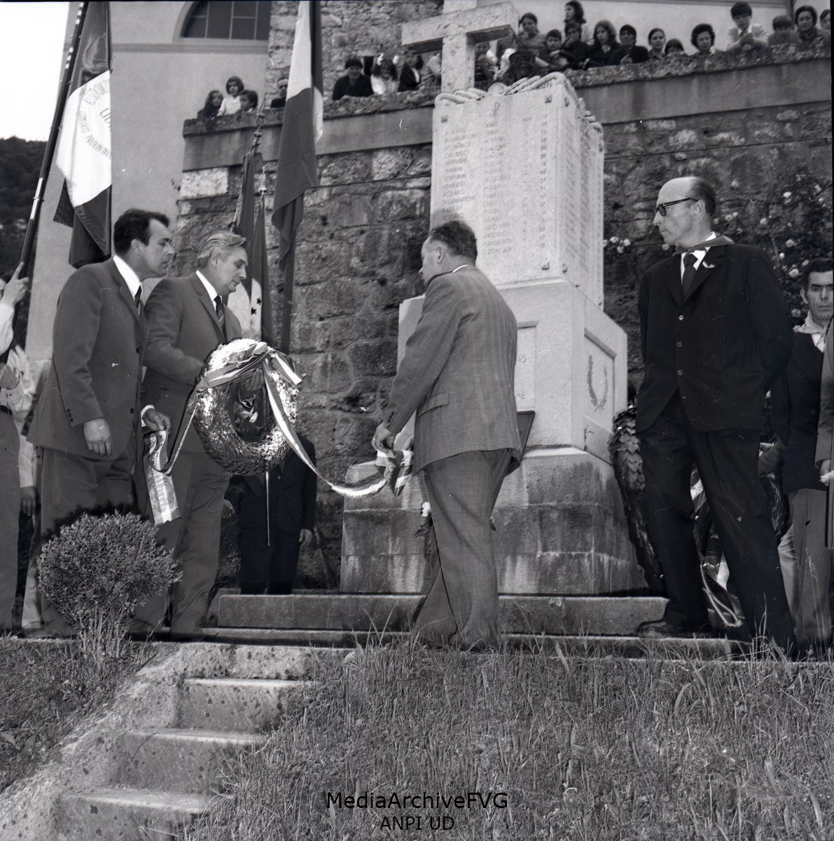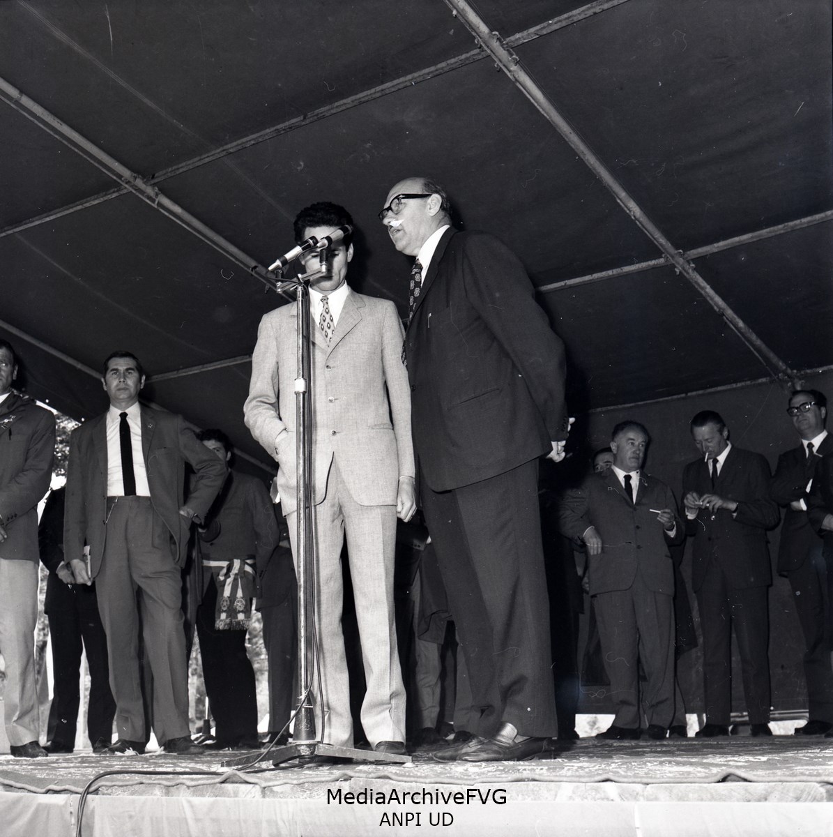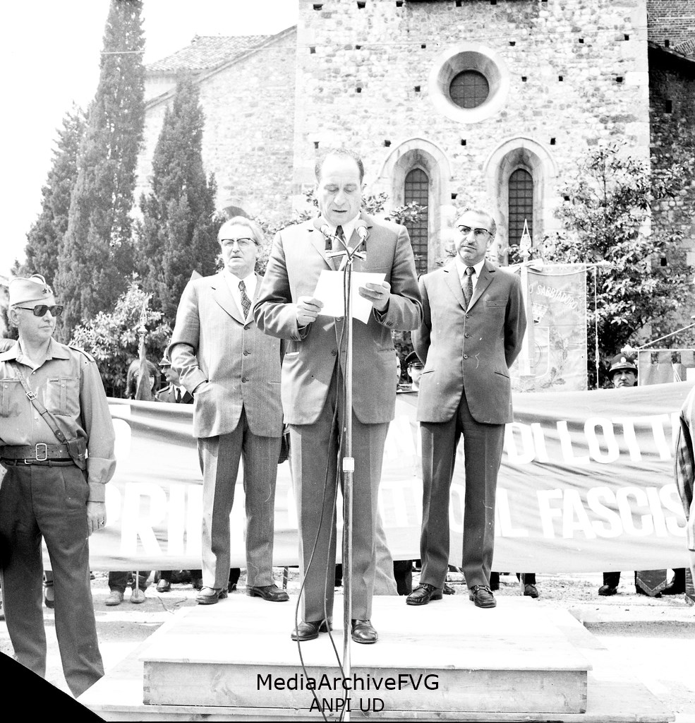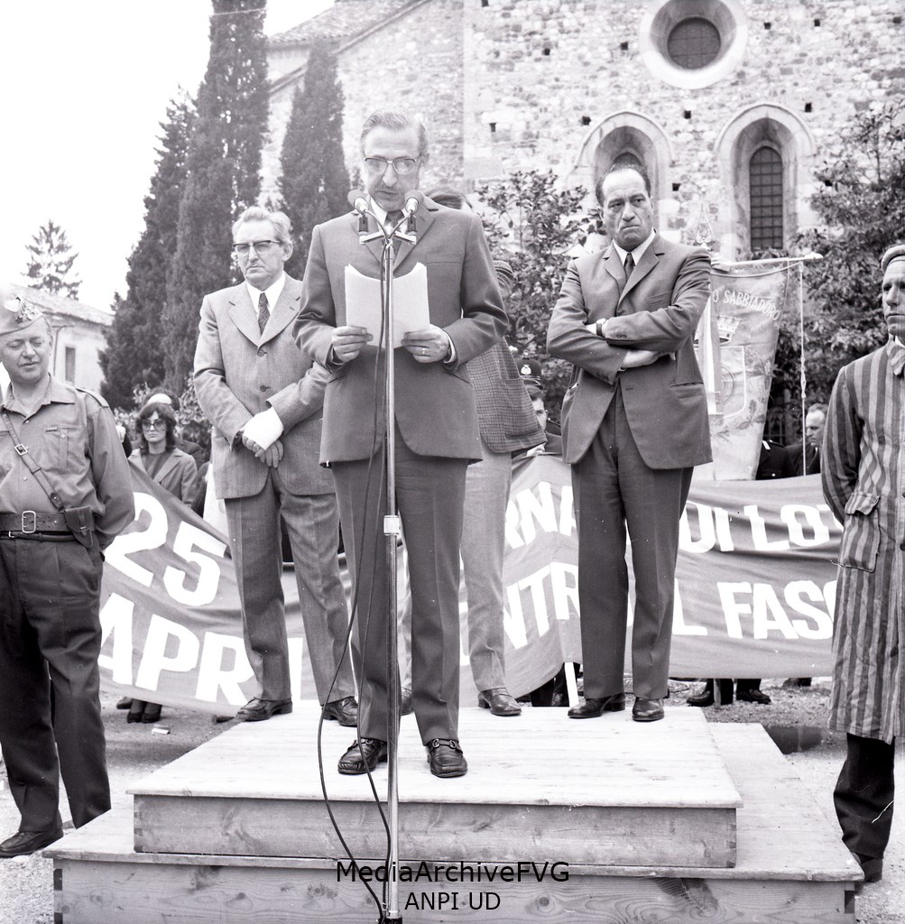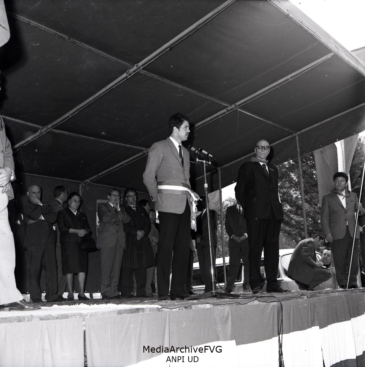Il 25 aprile a Udine. Un oratore sul palco di piazza Venerio. Mario Lizzero e Bruno Cadetto
