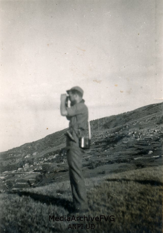Un partigiano osserva col binocolo