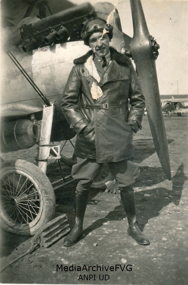 Ritratto di un aviatore con alle spalle il suo aeroplano