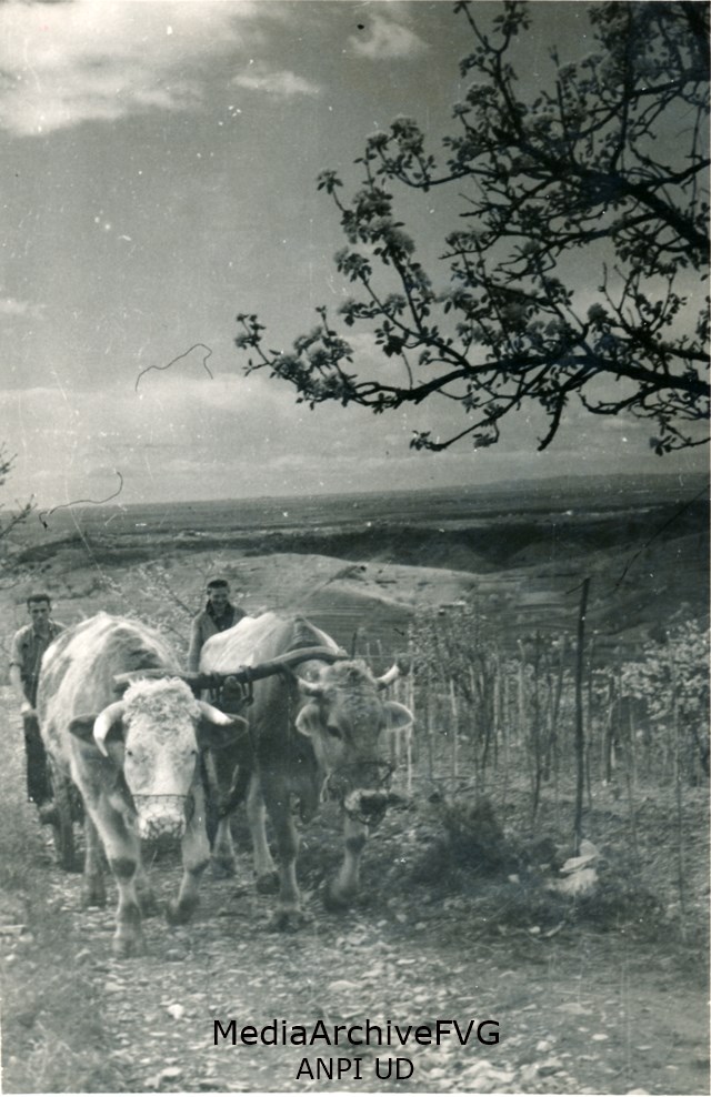Coppia di buoi al lavoro e dietro due contadini