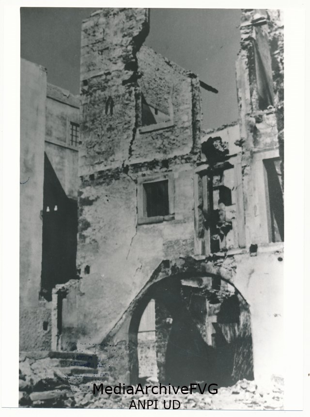 Una casa semidistrutta dall'incendio del paese causato dai nazifascisti