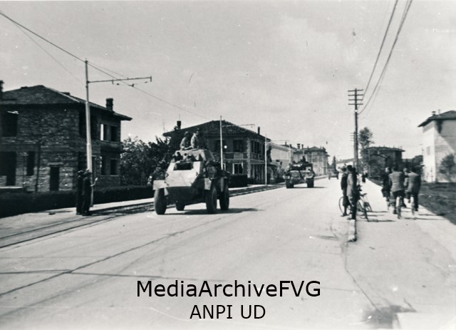 Ore 16: la prima autoblindo inglese in uscita dalla città diretta a nord