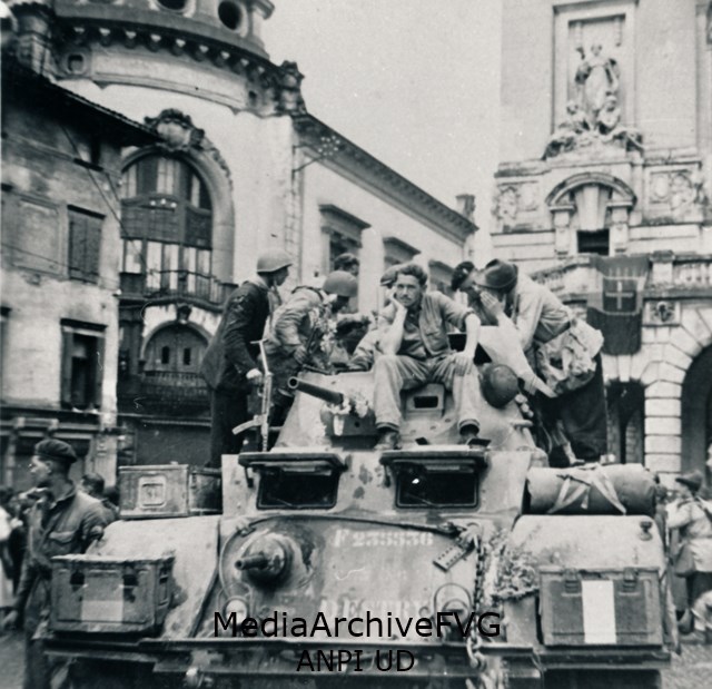 Mezzi corazzati alleati, partigiani e cittadini in piazza Libertà
