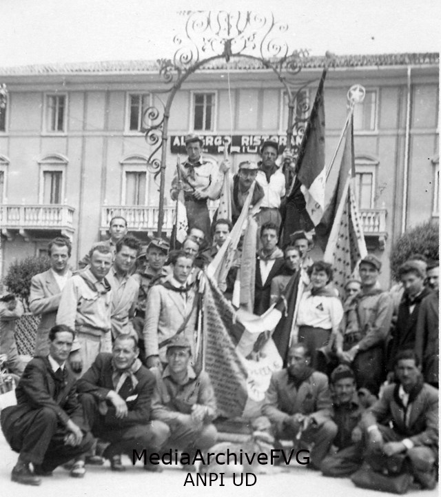 Gruppo di partigiani con bandiere davanti all'albergo Friuli