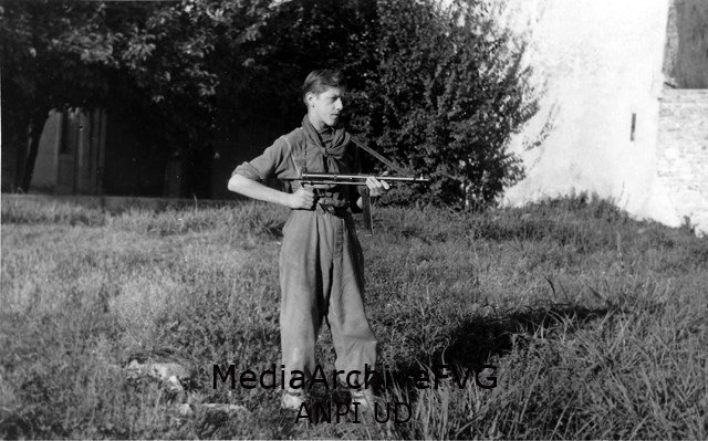 Giovane partigiano in posa mentra imbraccia un MP40