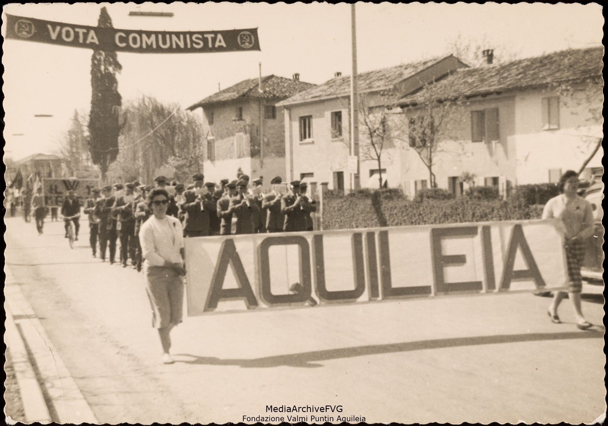 Il corteo si apre con lo striscione di Aquileia sorretto da due donne. Segue la banda