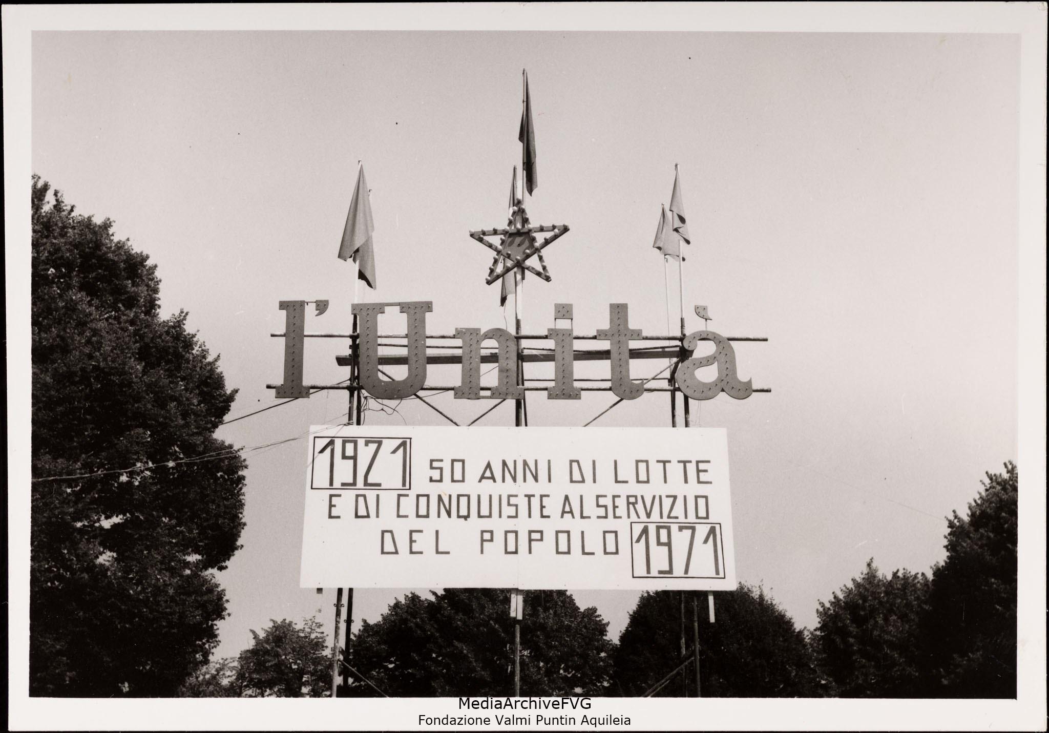 Sulla struttura metallica compare la scritta: L’Unità. Più in basso un cartellone con la frase “1921 cinquanta anni di lotte e di conquiste al servizio del popolo" seguita dall’anno 1971