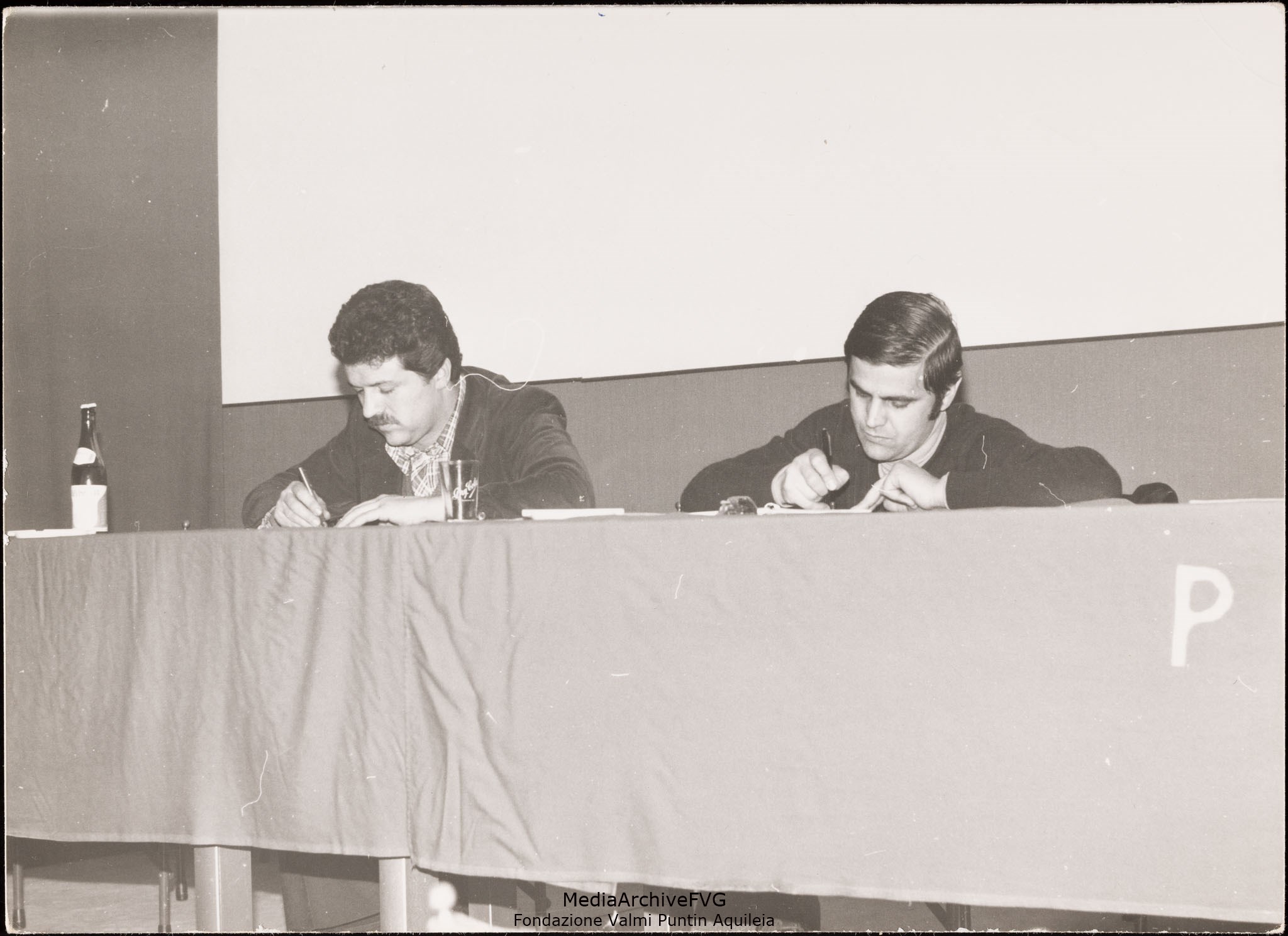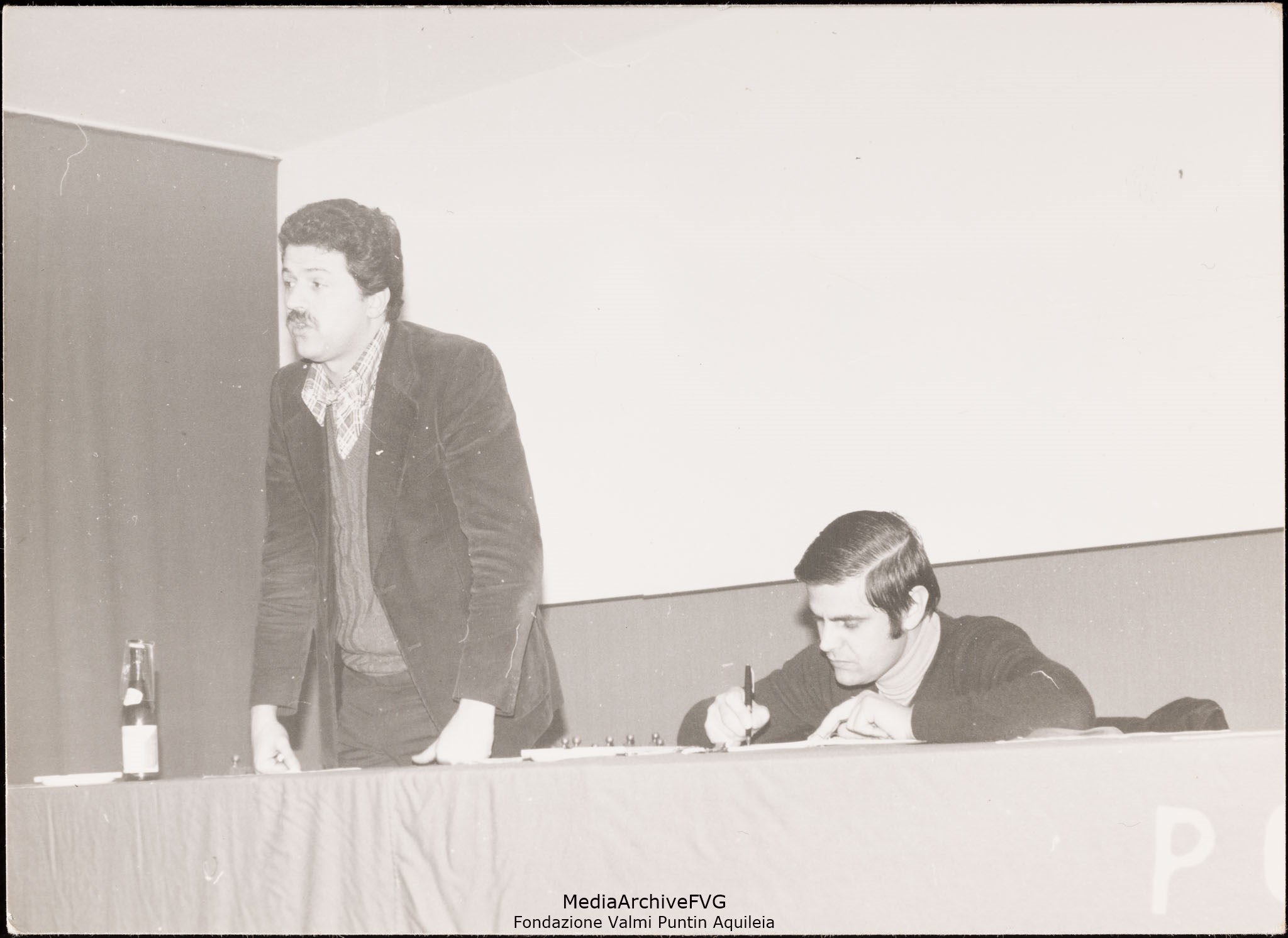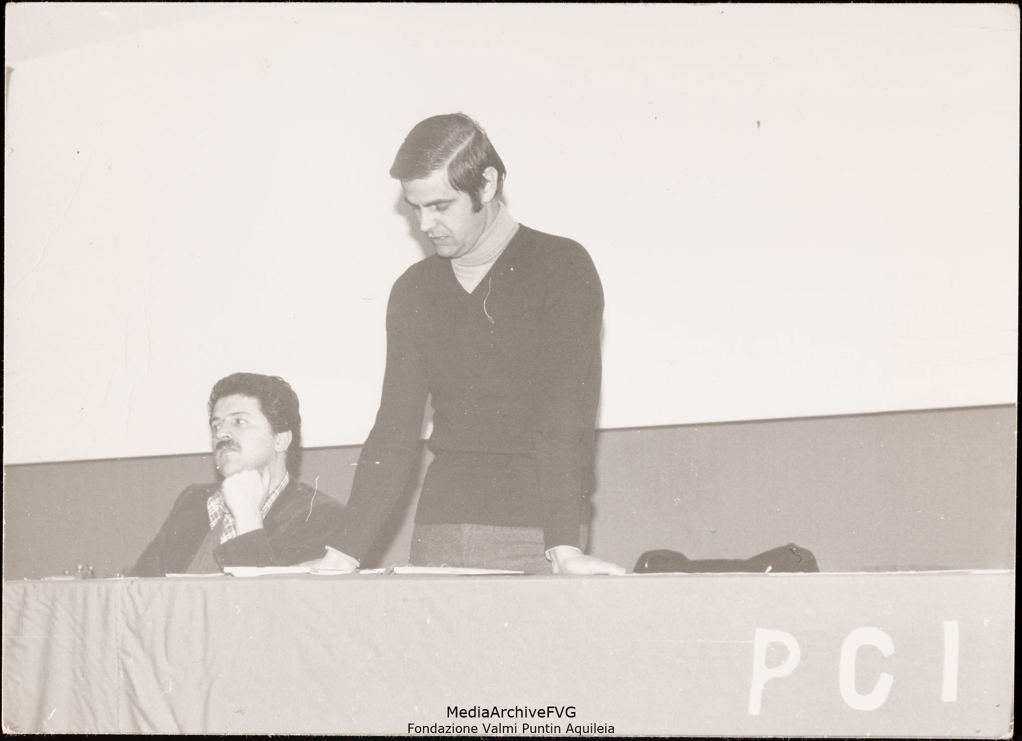 Assemblea del PCI di Aquileia. L'onorevole Giulio Colomba e Lucio Tolloi (segretario della sezione)