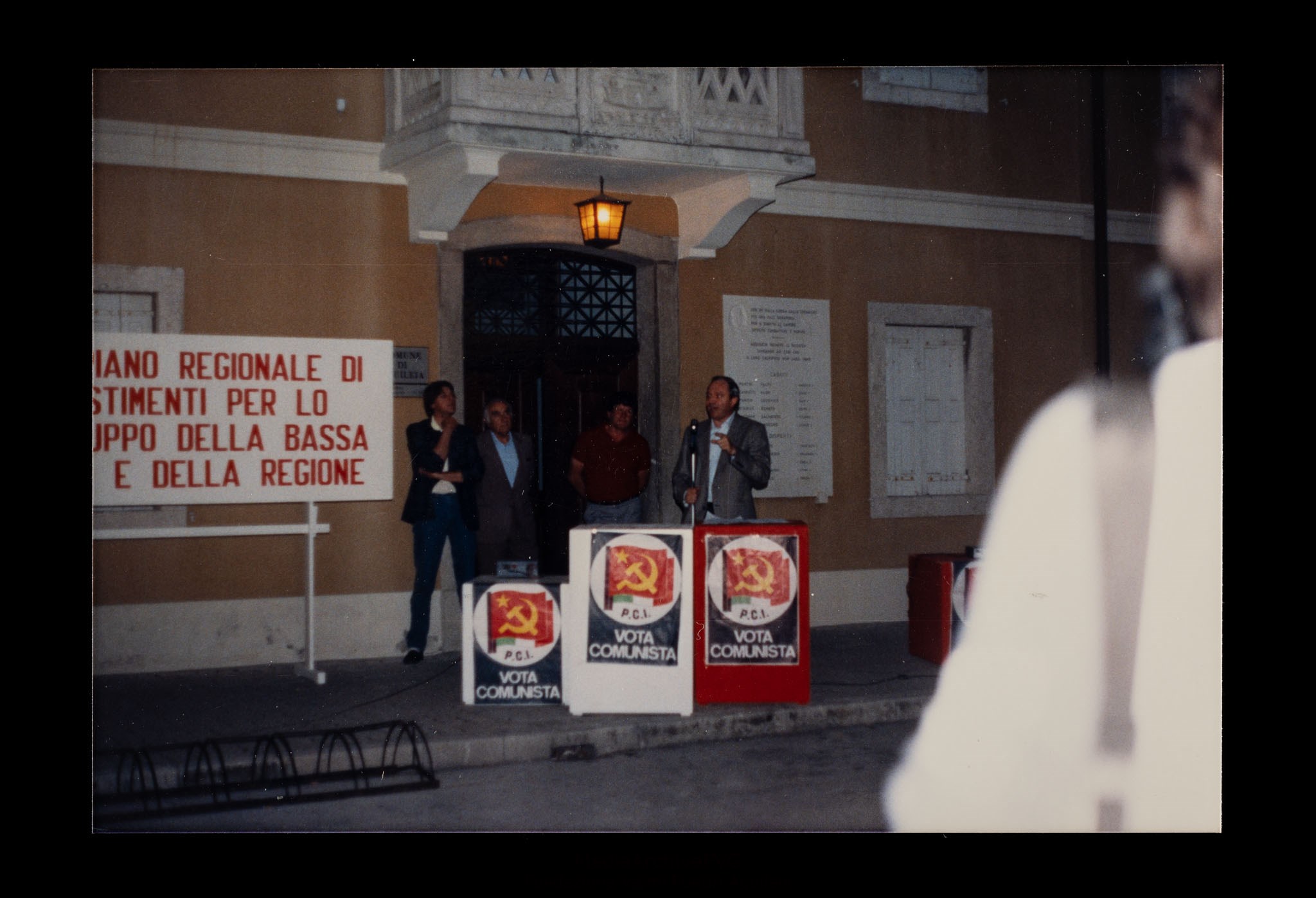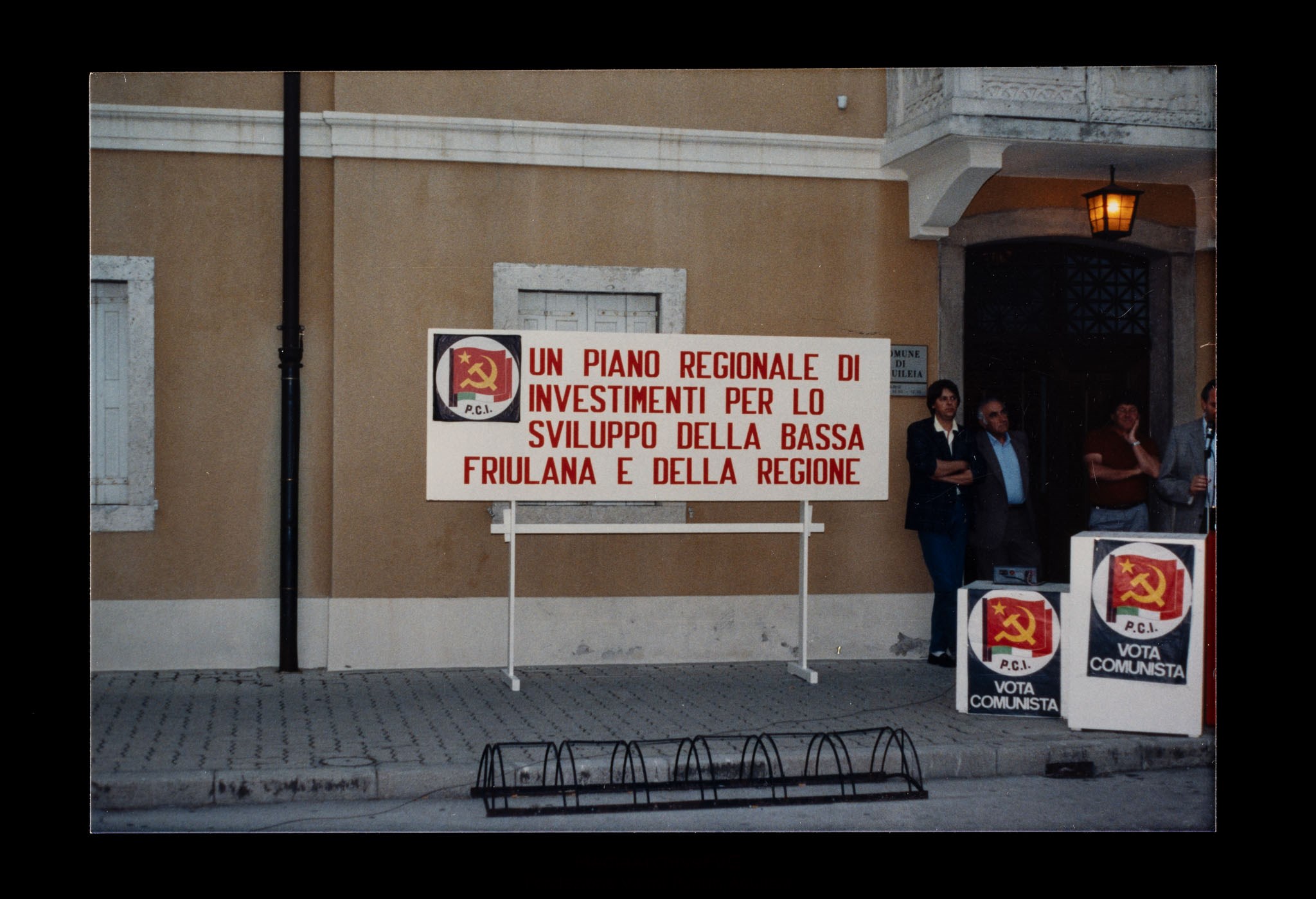 Comizio sul tema "Un piano regionale di investimenti per lo sviluppo della Bassa Friulana e della regione". Il cartello che riporta il tema del comizio