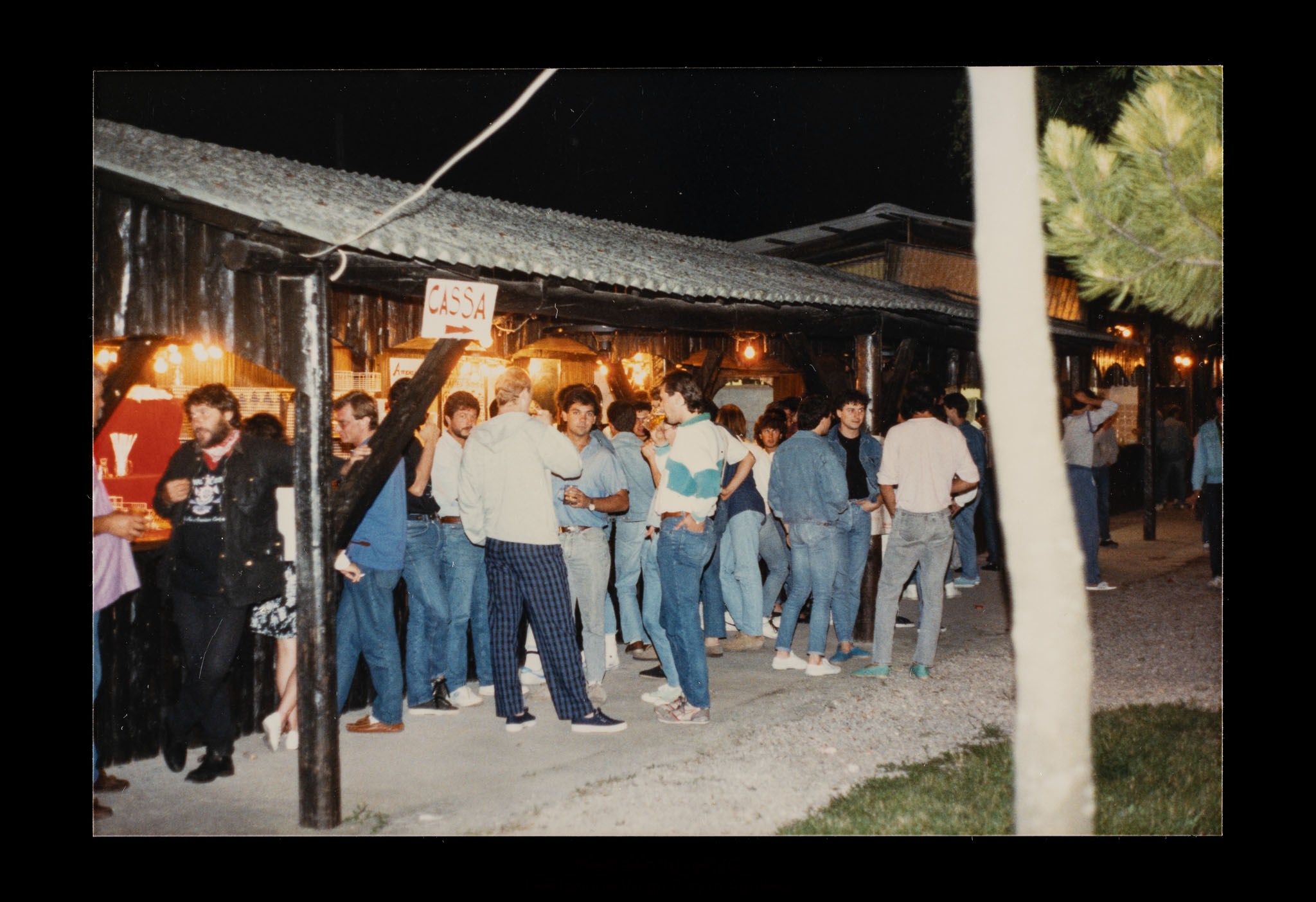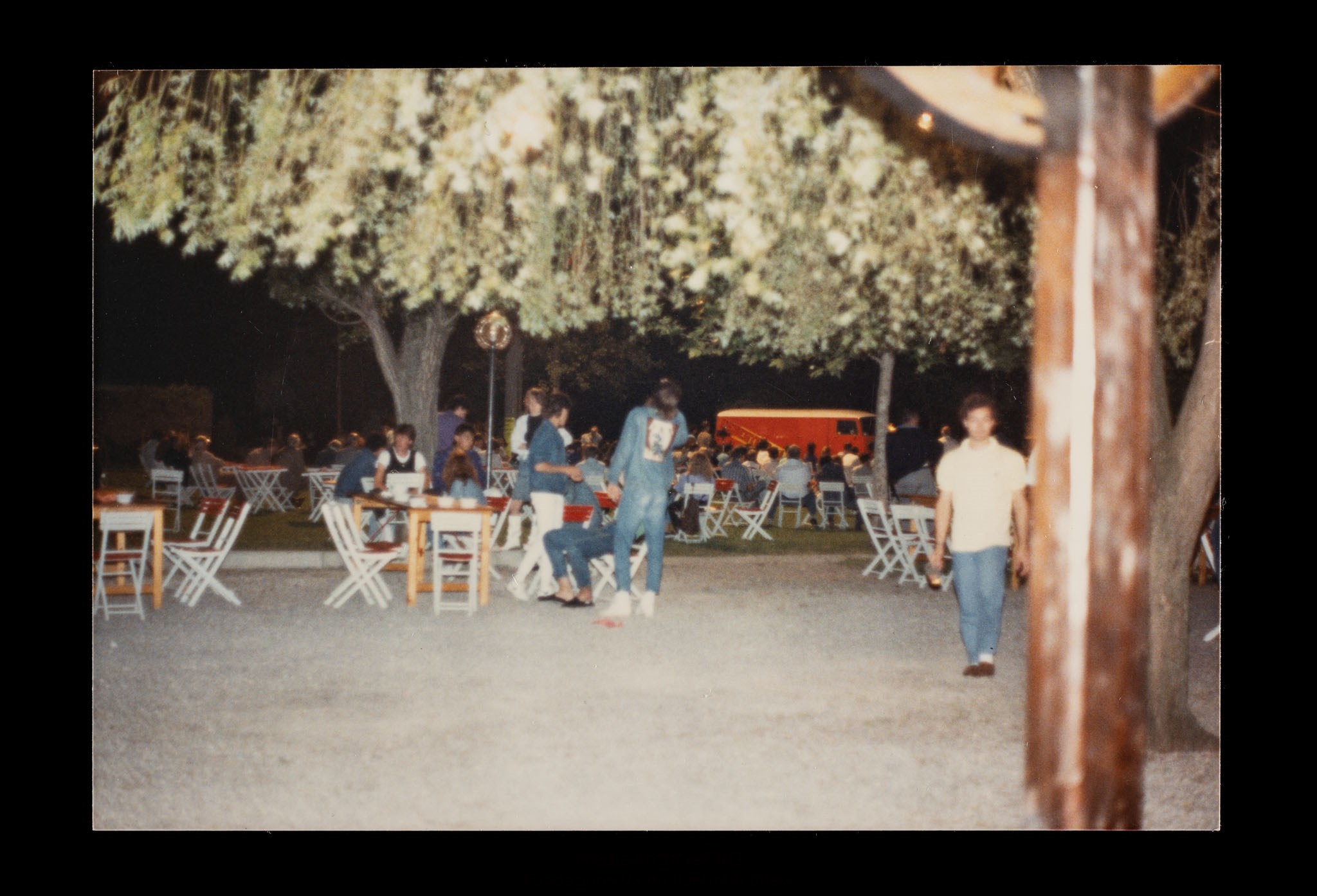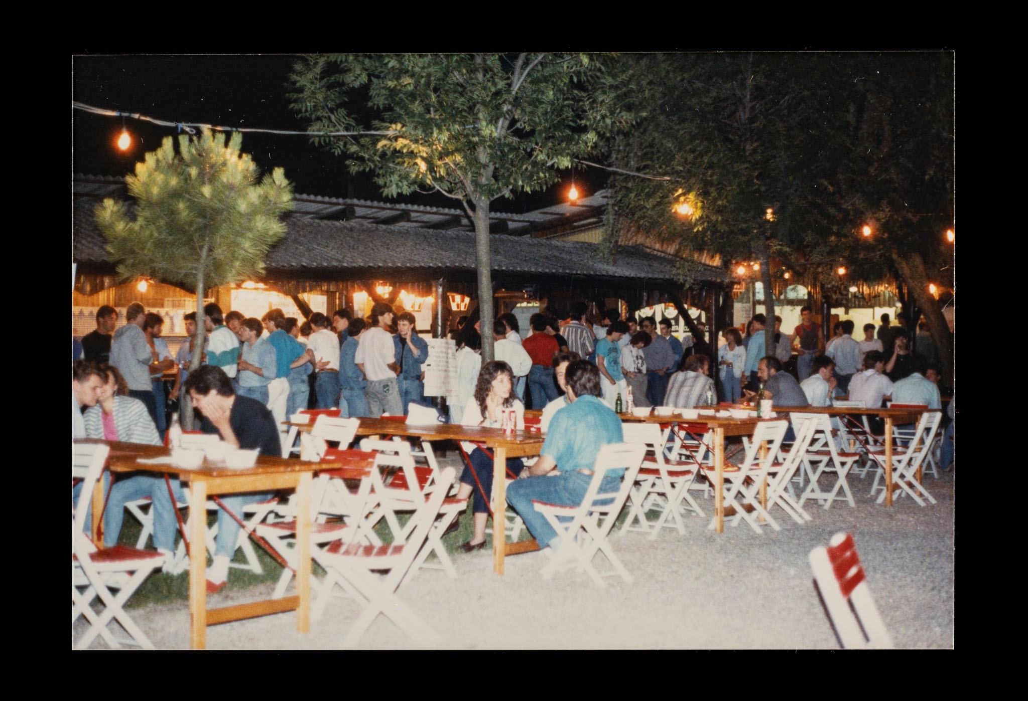 Festa o festival dell’Unità ad Aquileia. Partecipanti davanti a un chiosco e ai tavoli