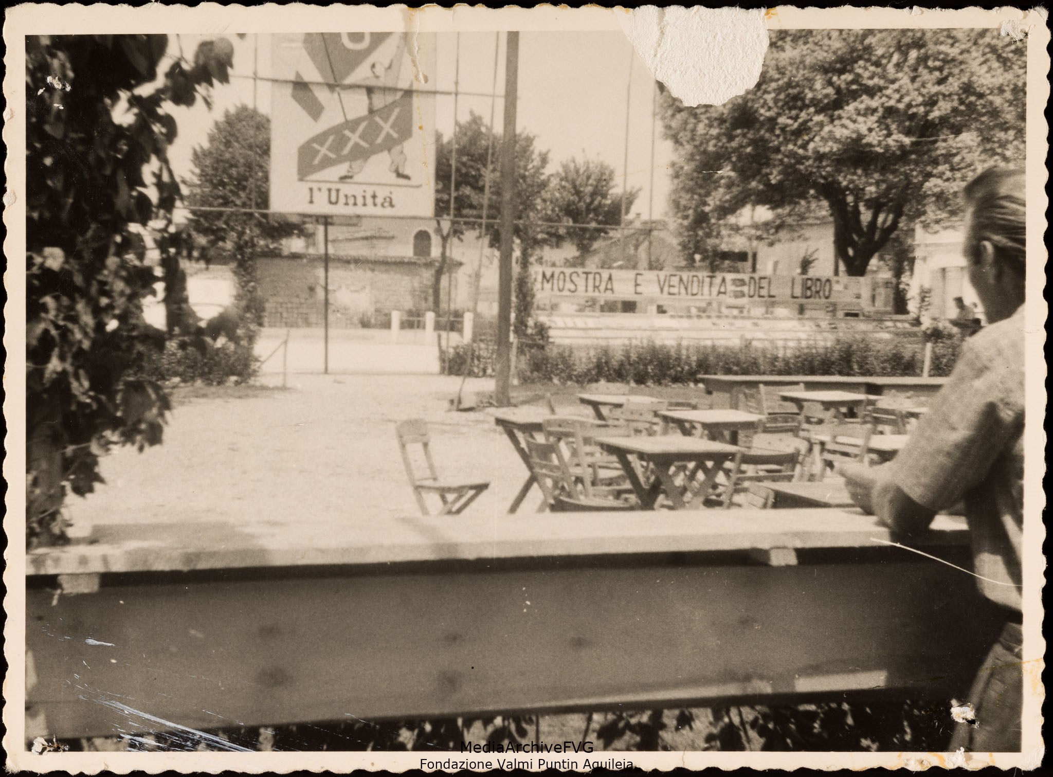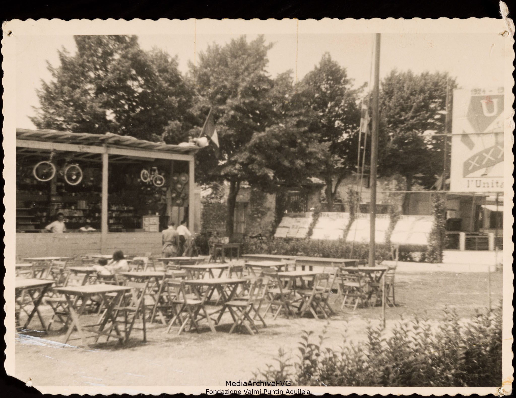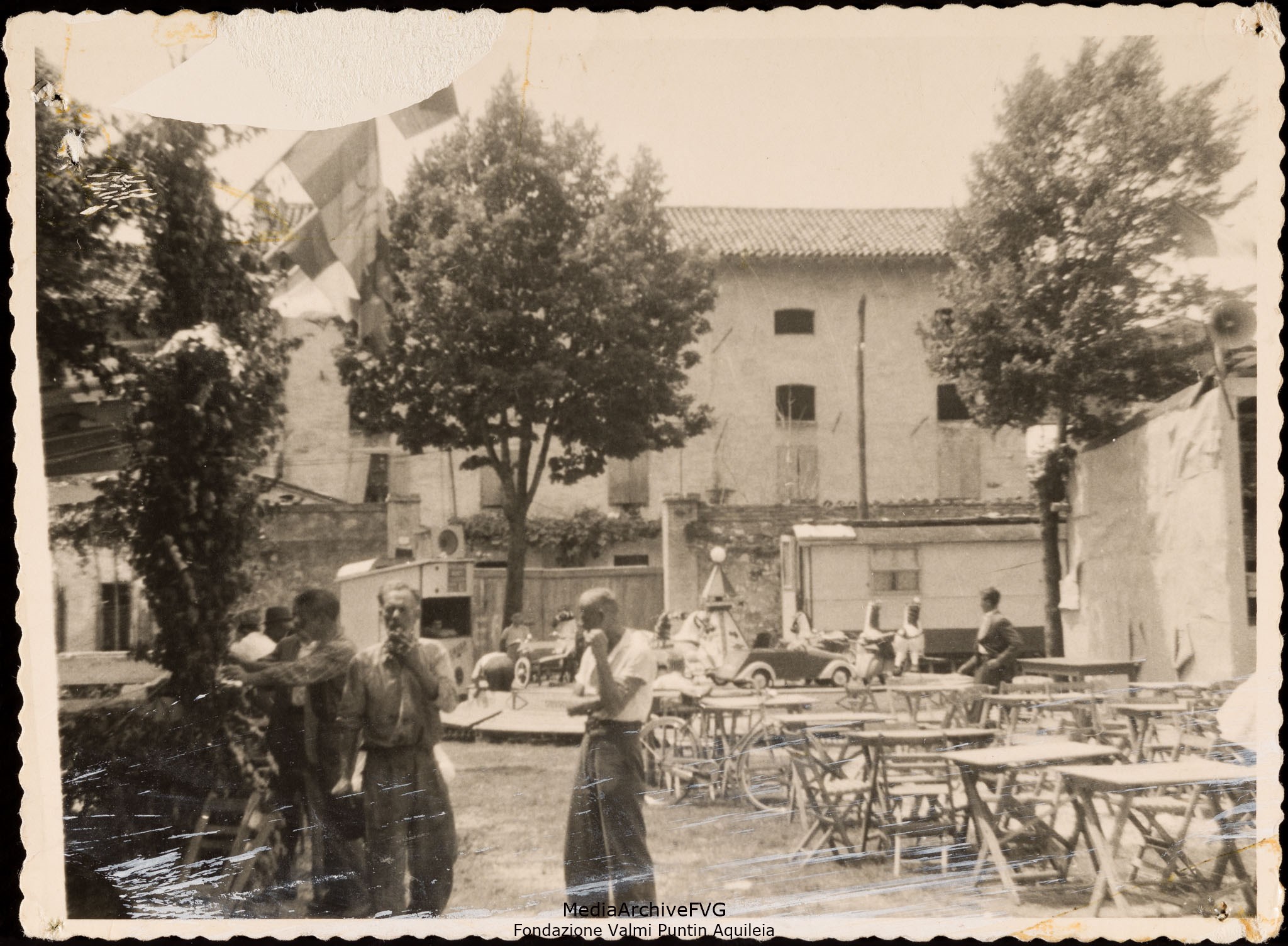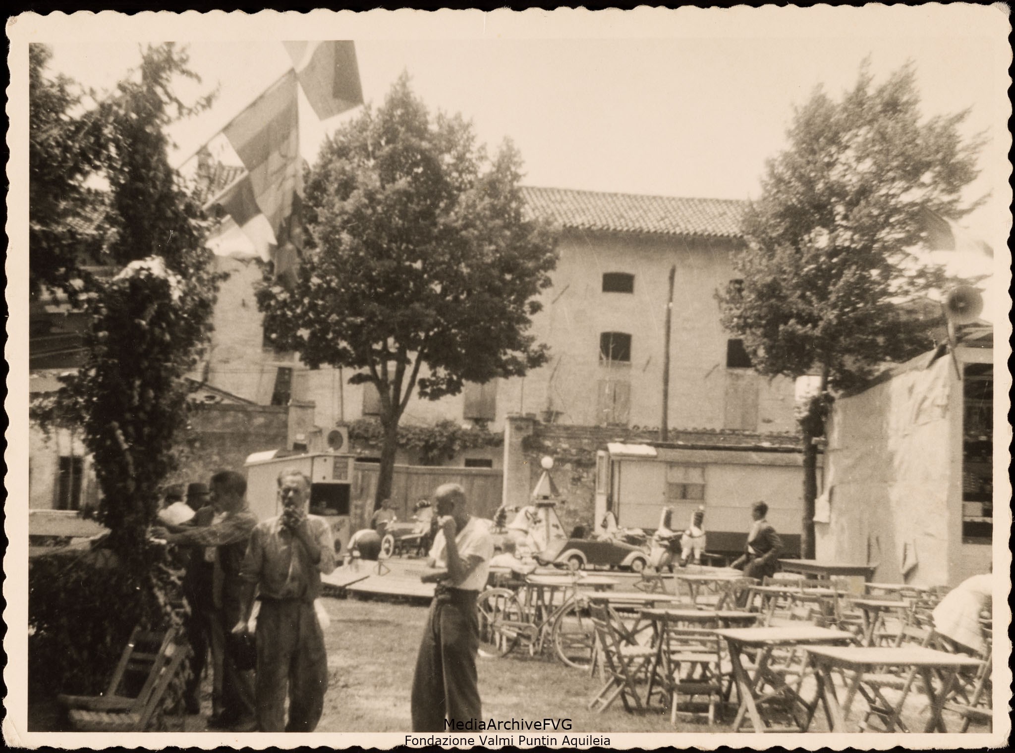 Festa o festival dell’Unità ad Aquileia. Panoramica di piazza San Giovanni allestita con tavoli e sedie. Il chiosco della pesca di beneficenza