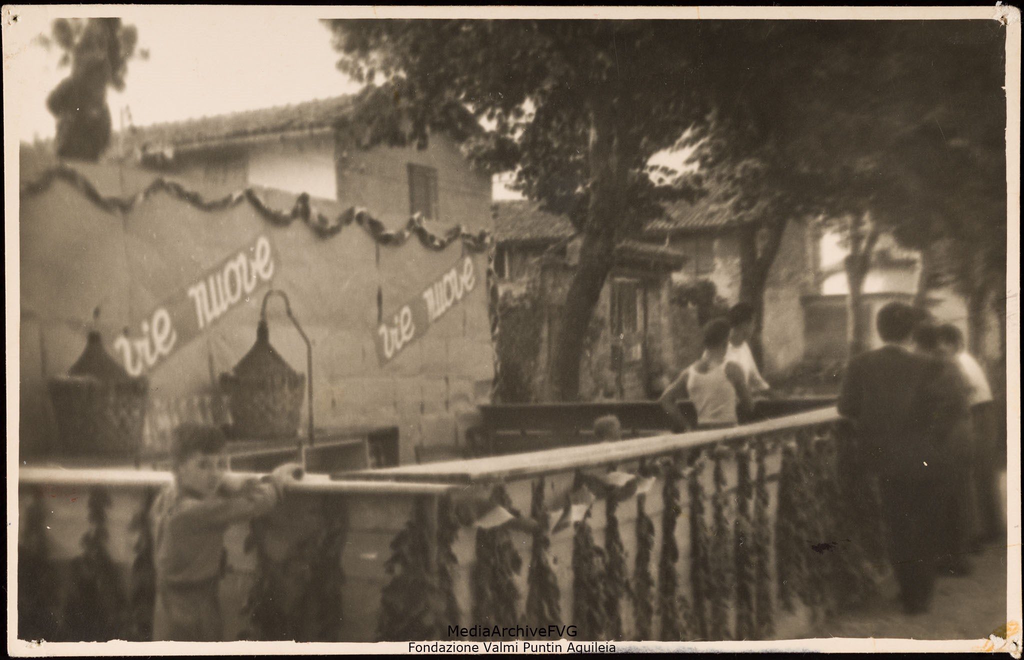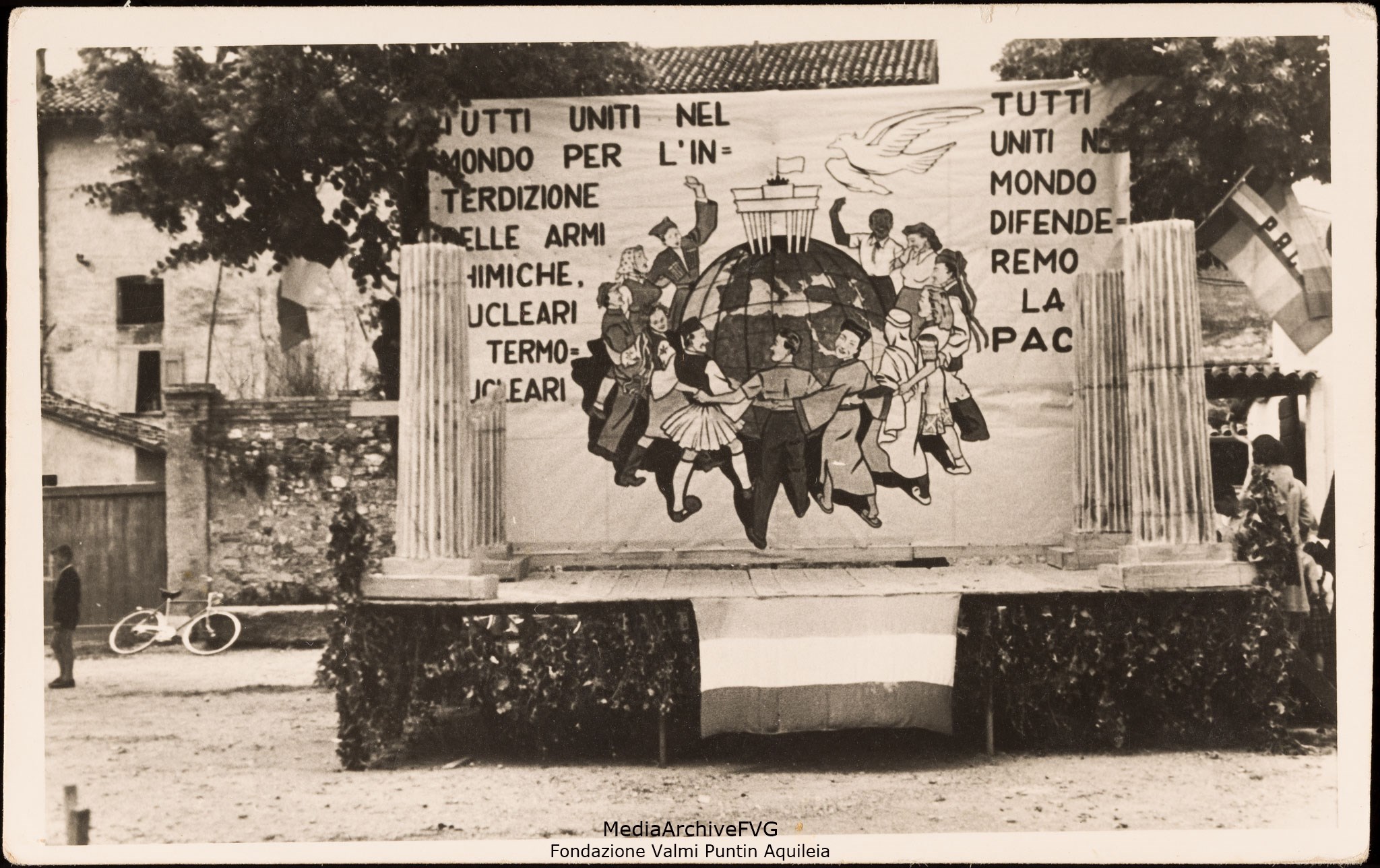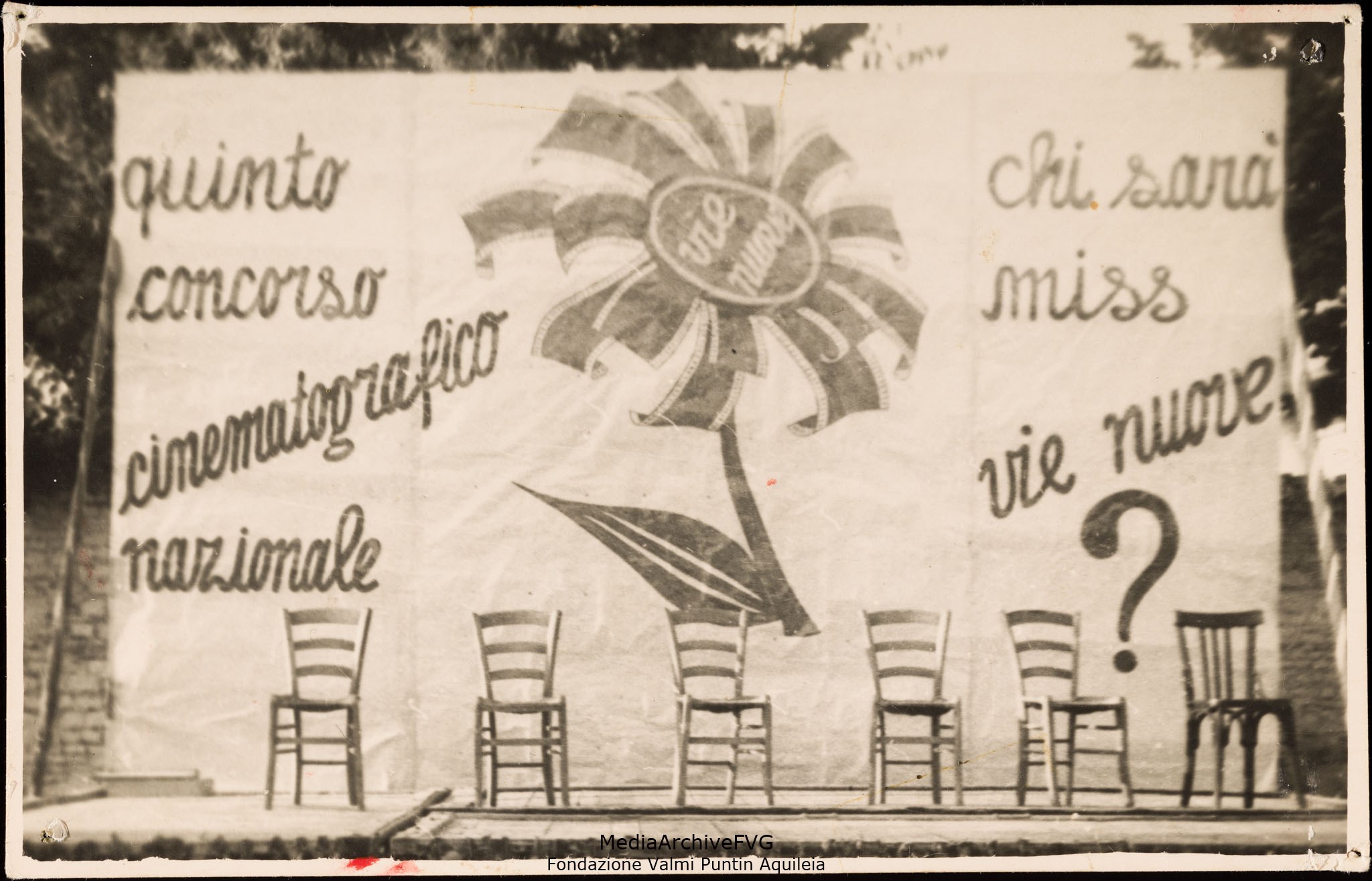 Festa o festival dell’Unità ad Aquileia. Il palco con lo fondo dedicato al quinto concorso nazionale per l’elezione di Miss Vie Nuove