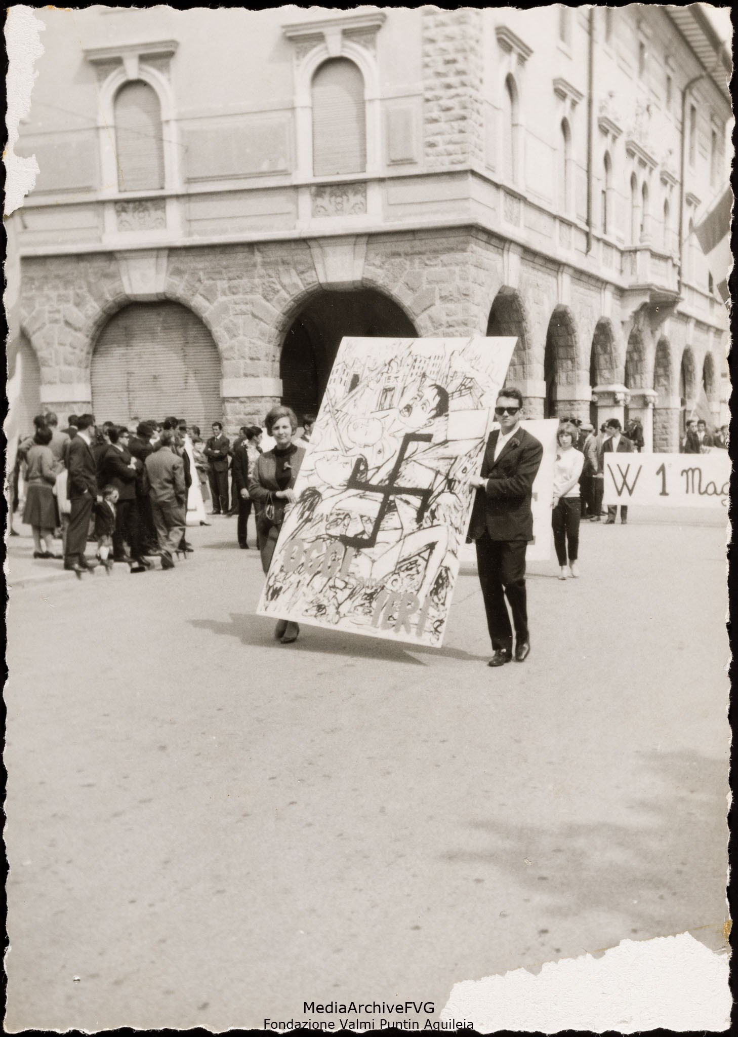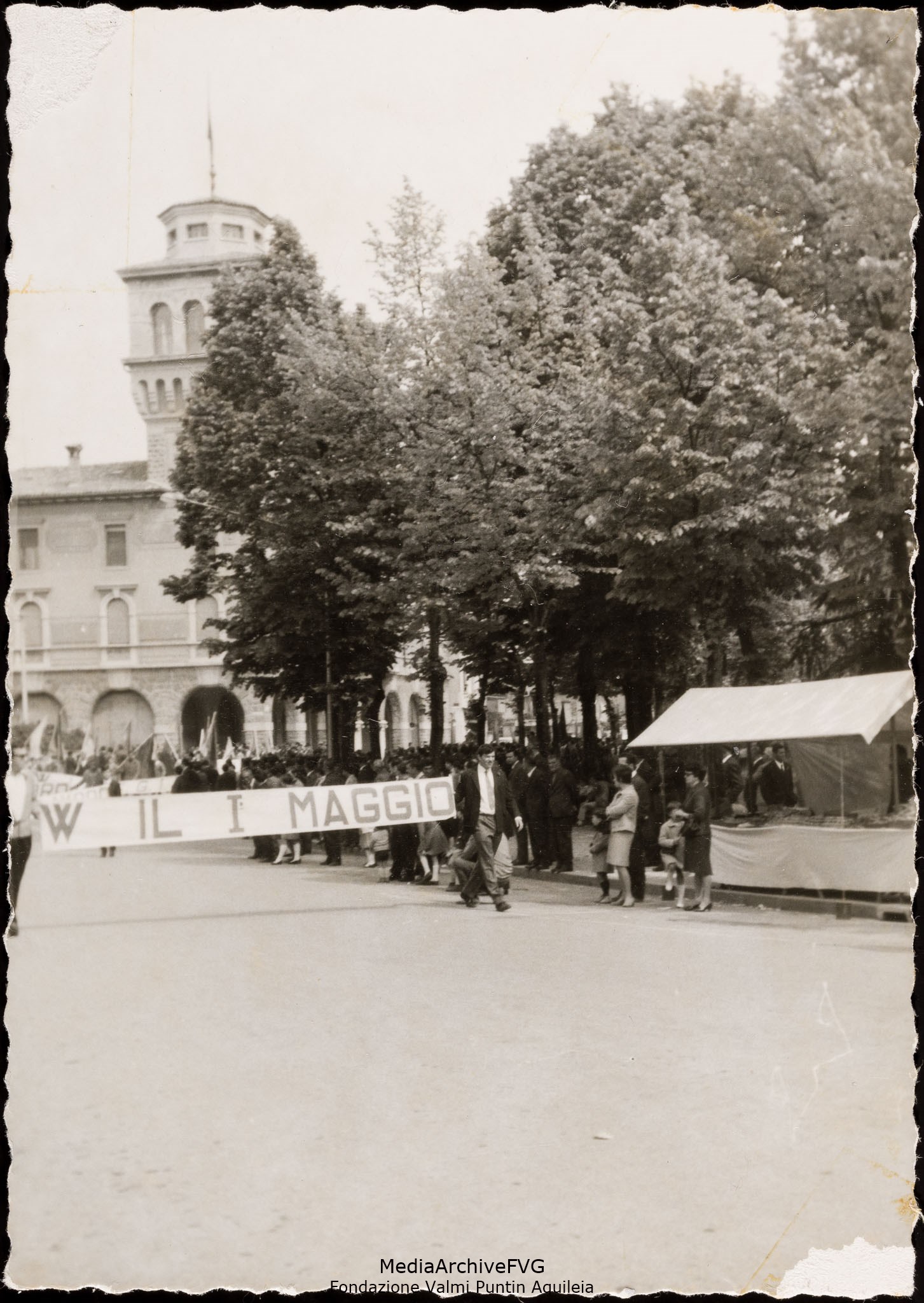 Festa del 1° maggio di Cervignano del Friuli. Ingresso in piazza Indipendenza dello striscione con la scritta "W il 1° maggio"