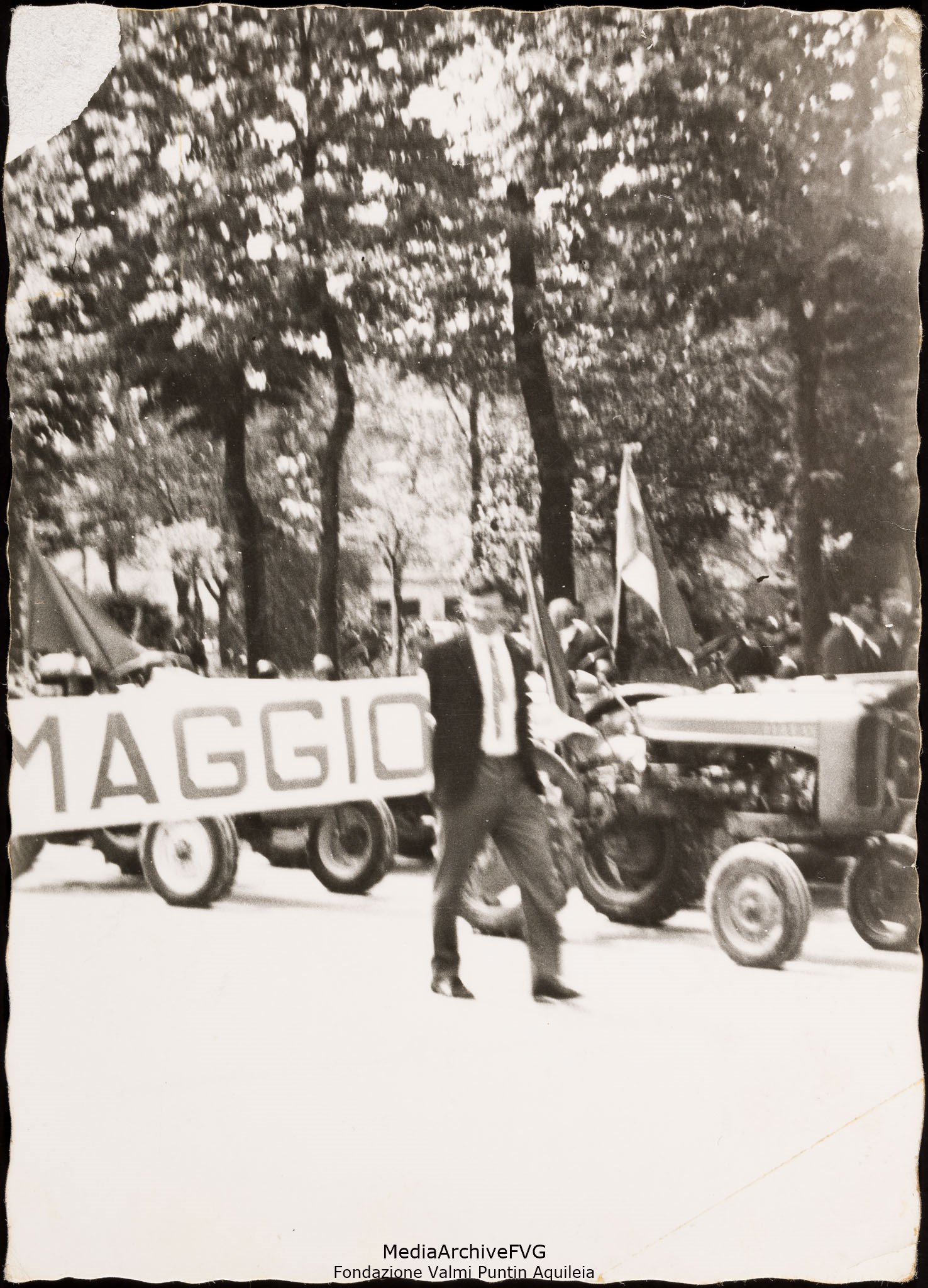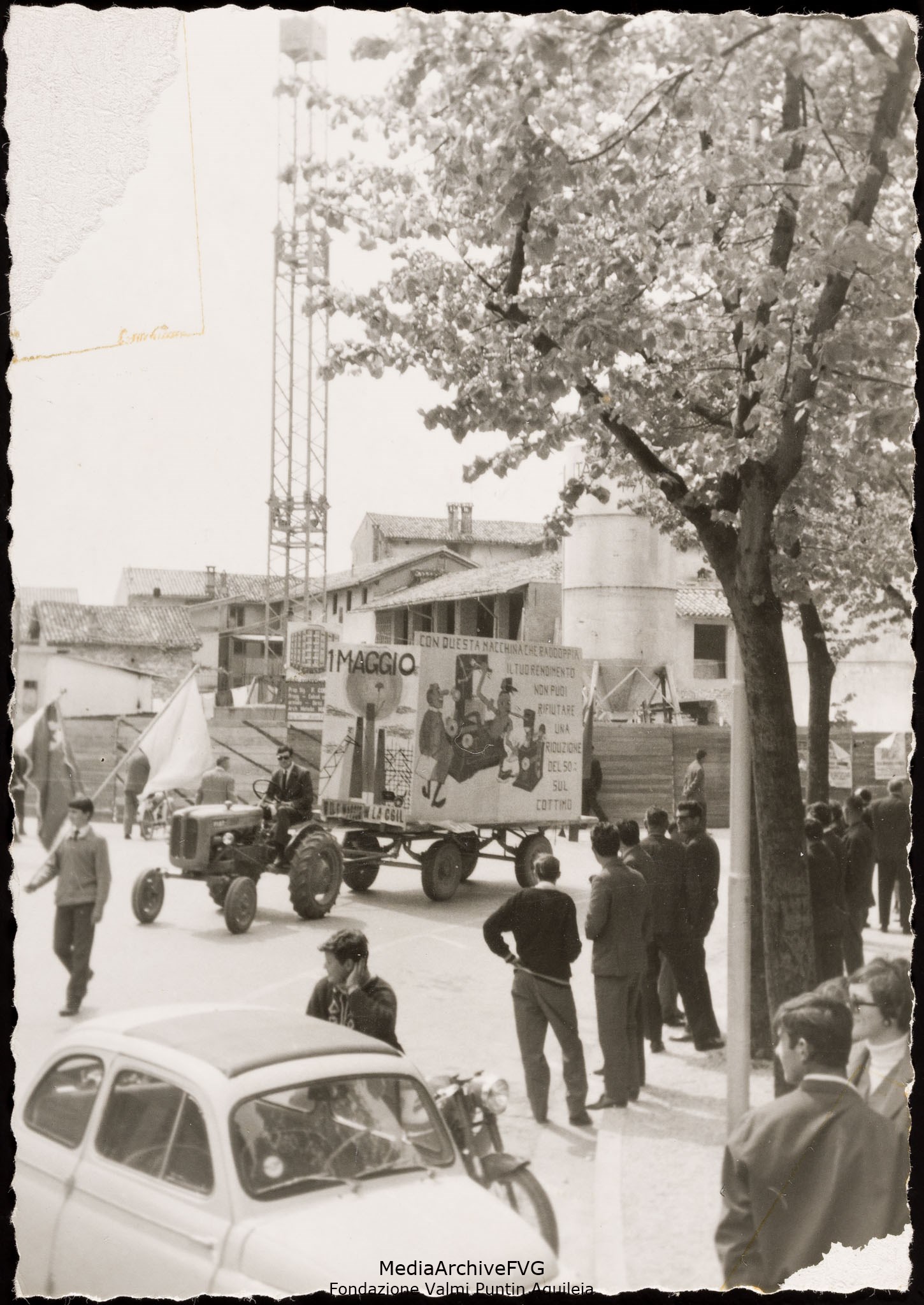 Festa del 1° maggio di Cervignano del Friuli. Un trattore con carro allestito per la manifestazione sfila per raggiungere piazza Indipendenza