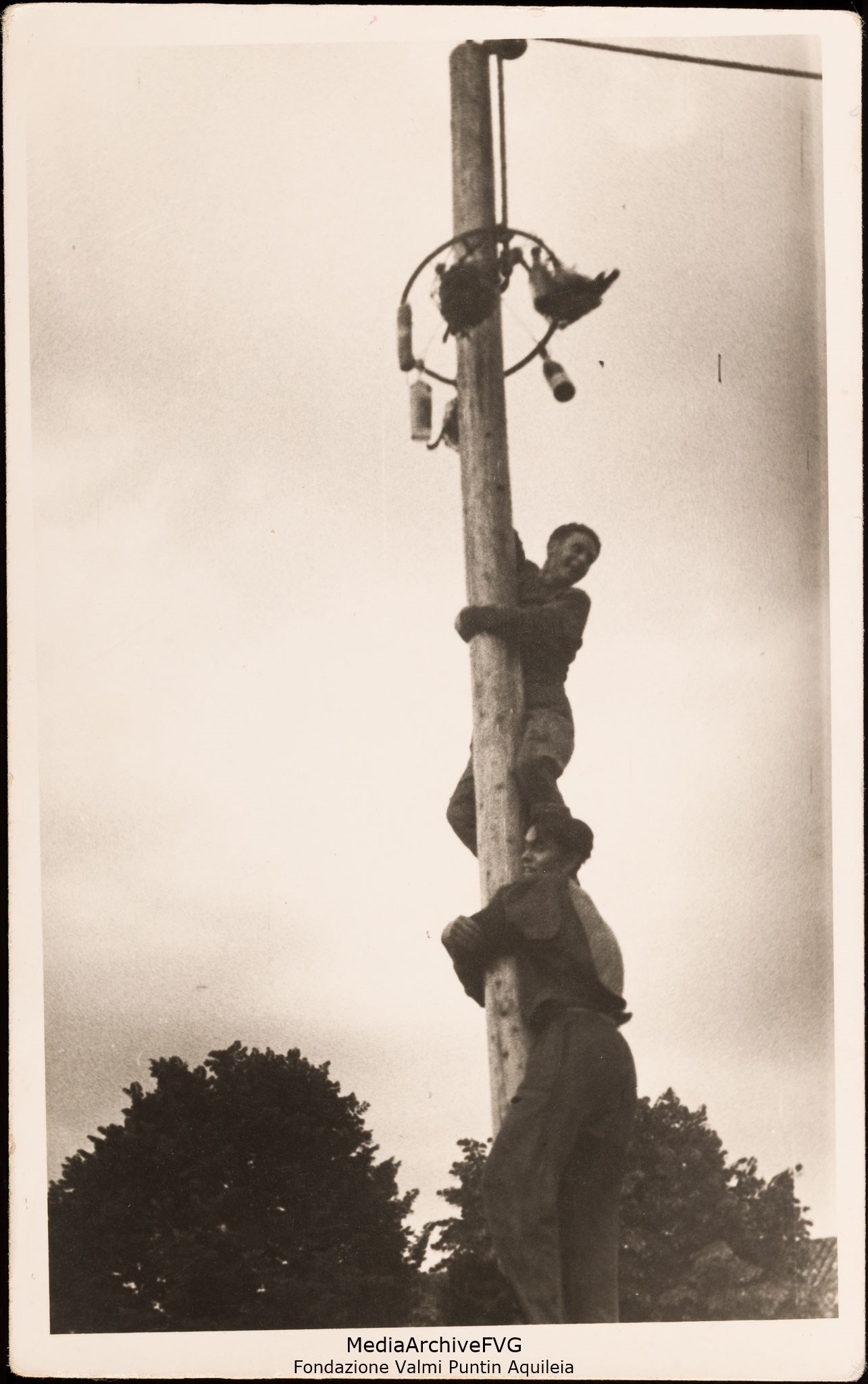 Festa o festival dell’Unità ad Aquileia. I concorrenti impegnati a raggiungere la cima del palo della cuccagna