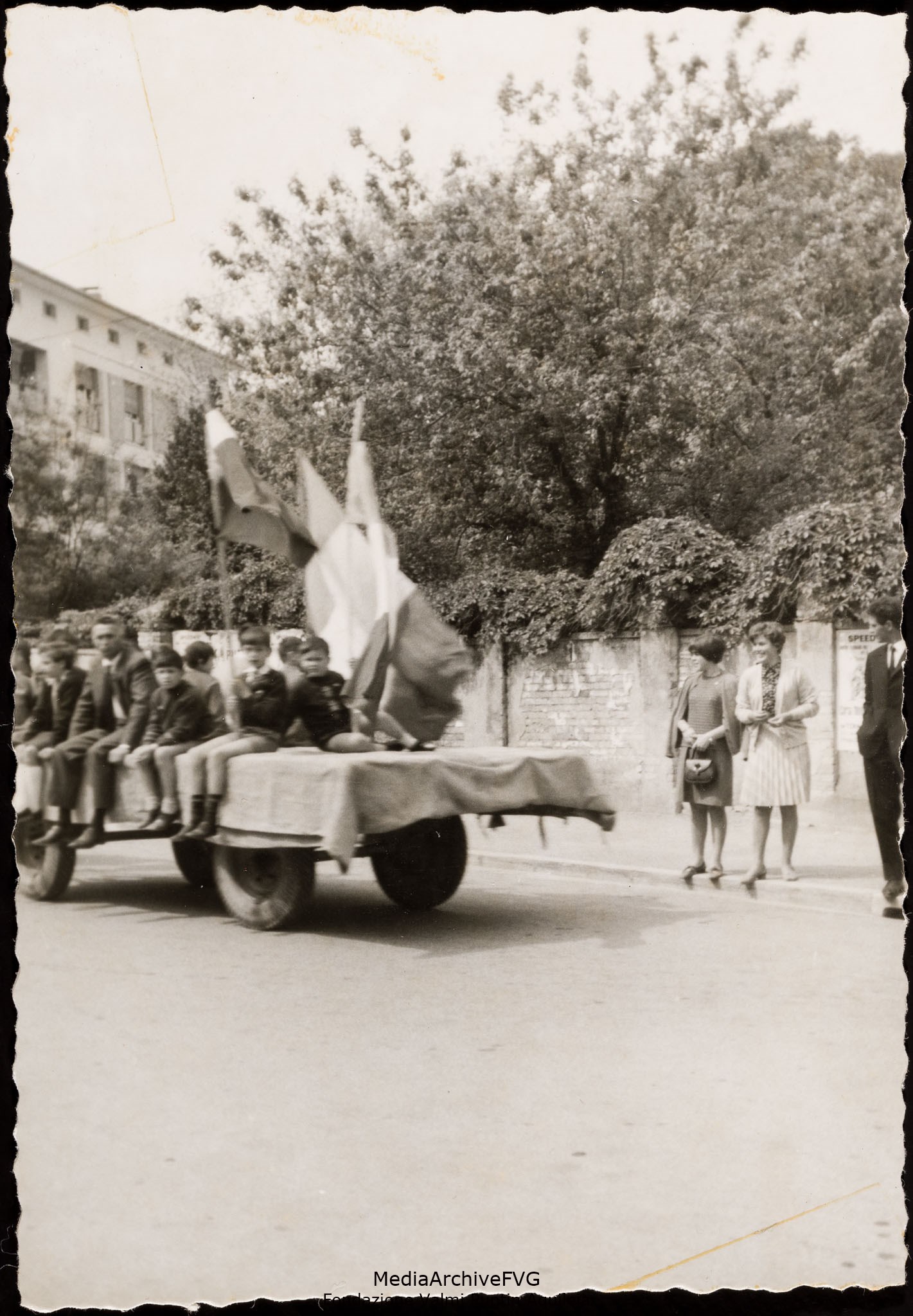 Festa del 1° maggio di Cervignano del Friuli. Un carro con bambini e bandiere raggiunge Cervignano