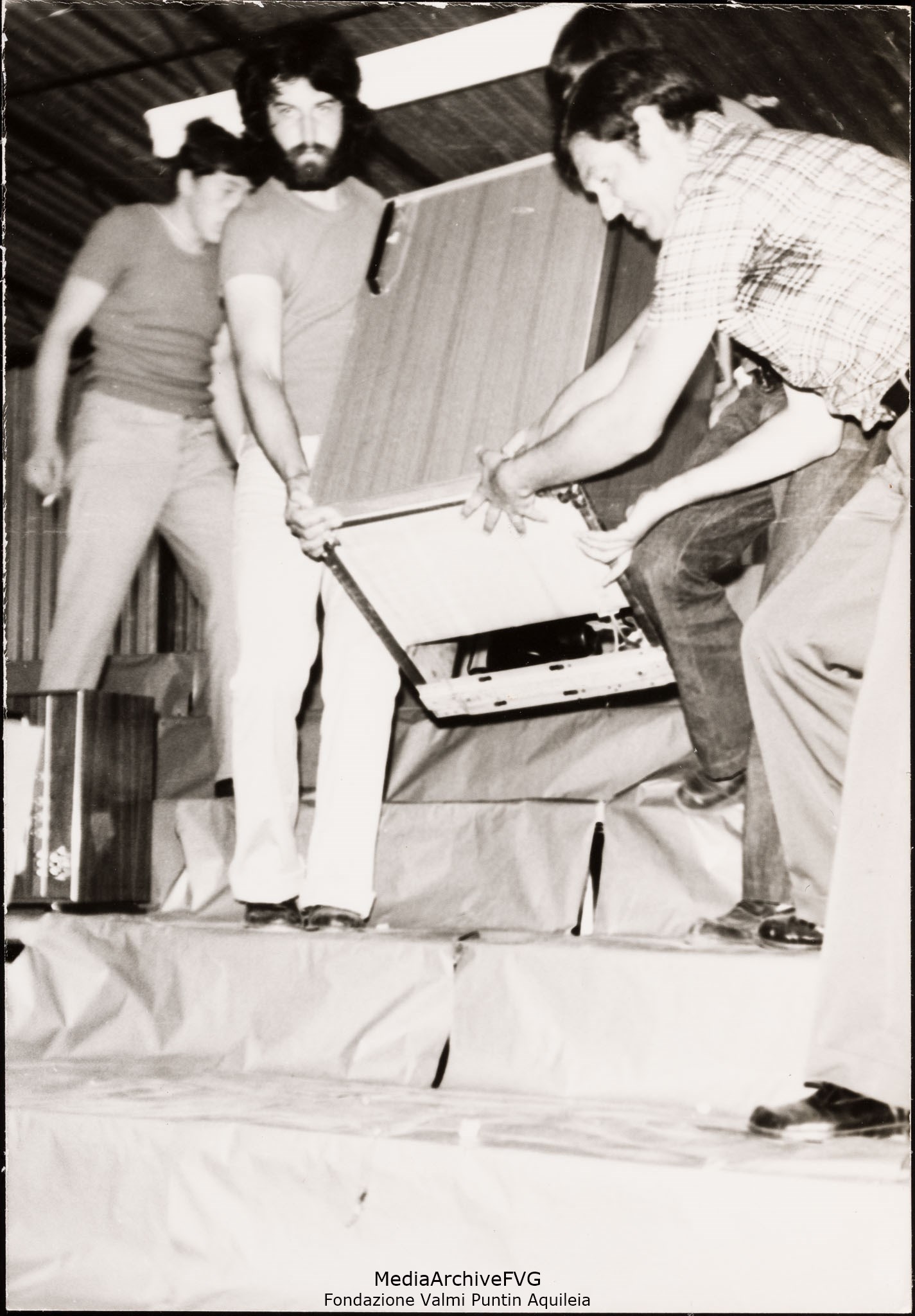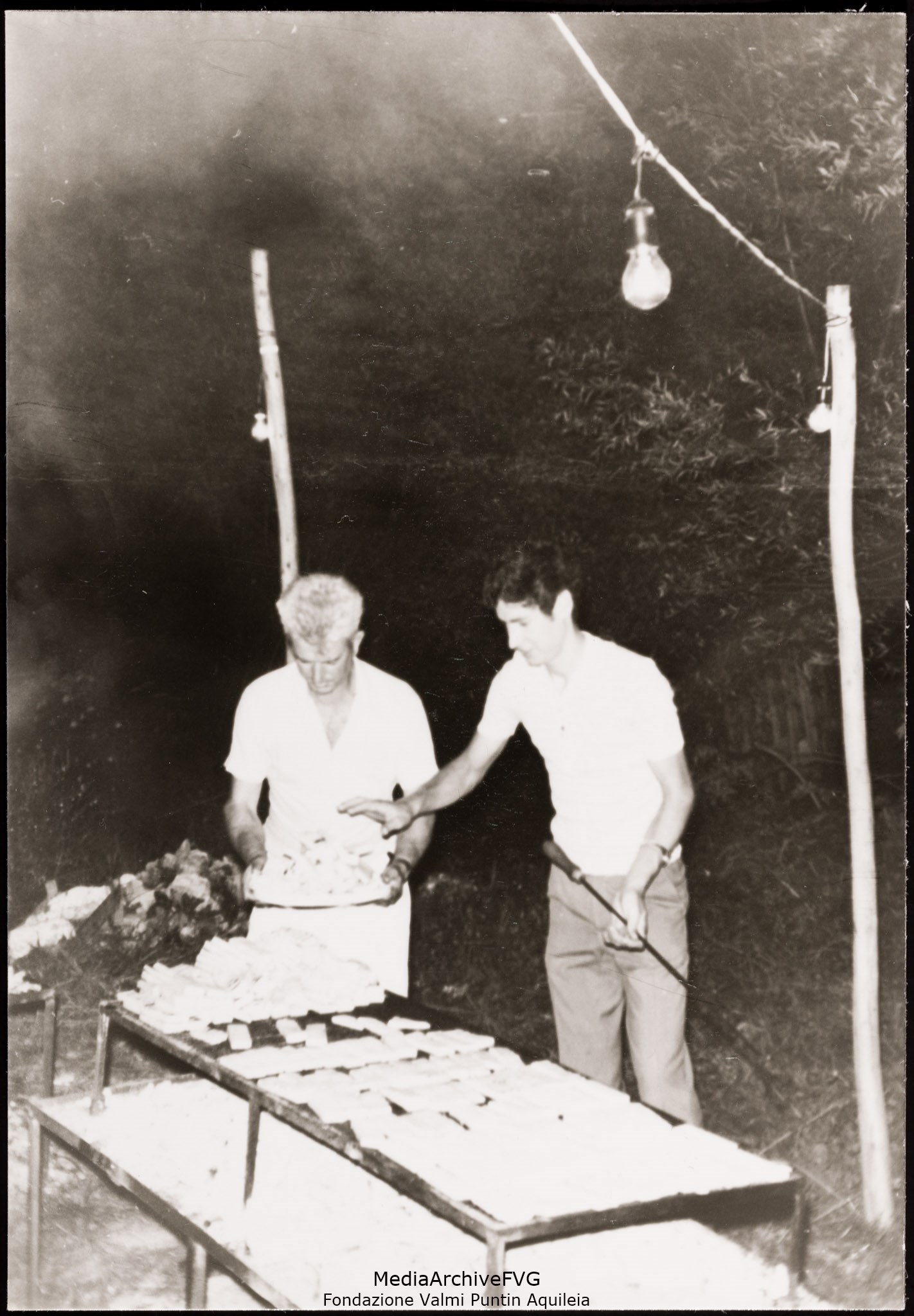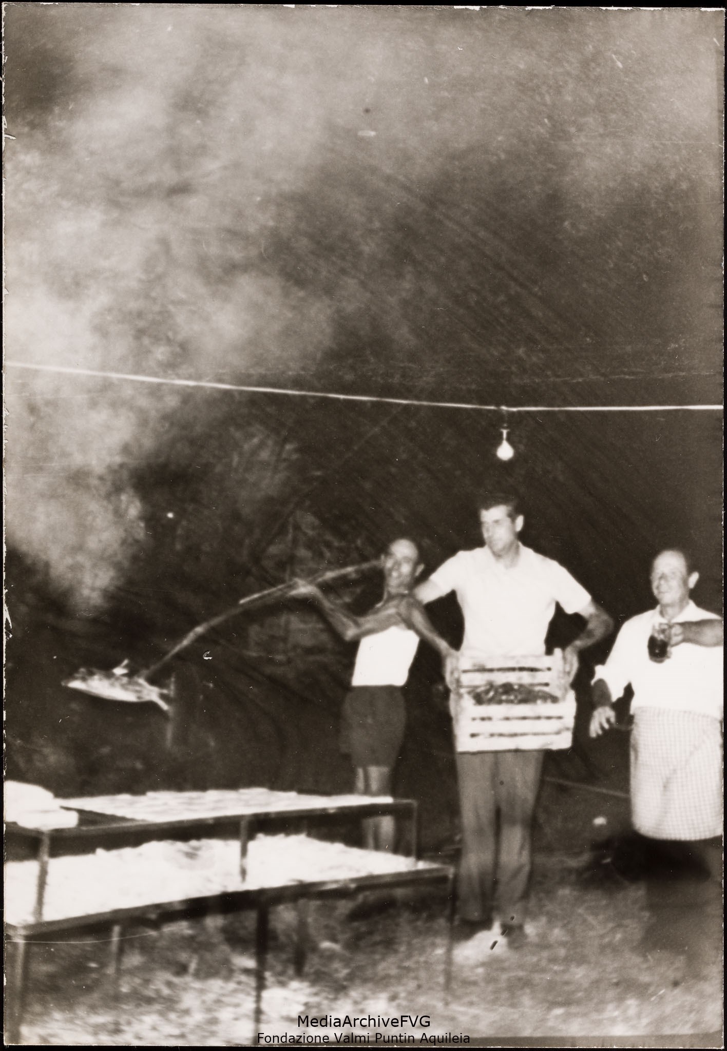 Festa o festival dell’Unità ad Aquileia. Volontari addetti alle griglie. Alfredo Virgolin porta una cassetta di salsicce