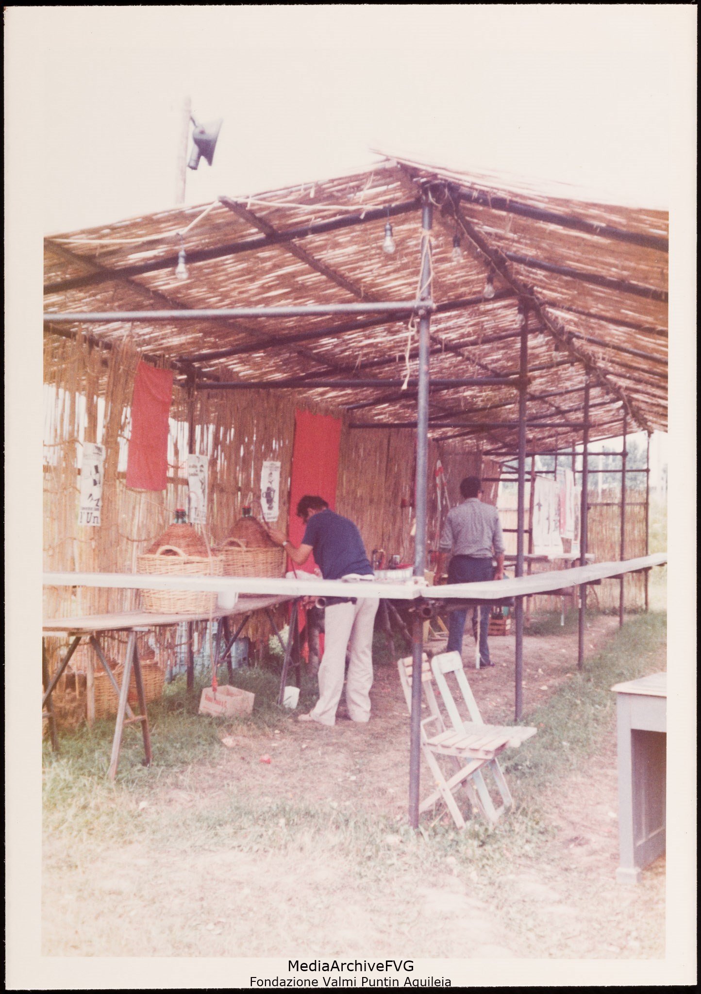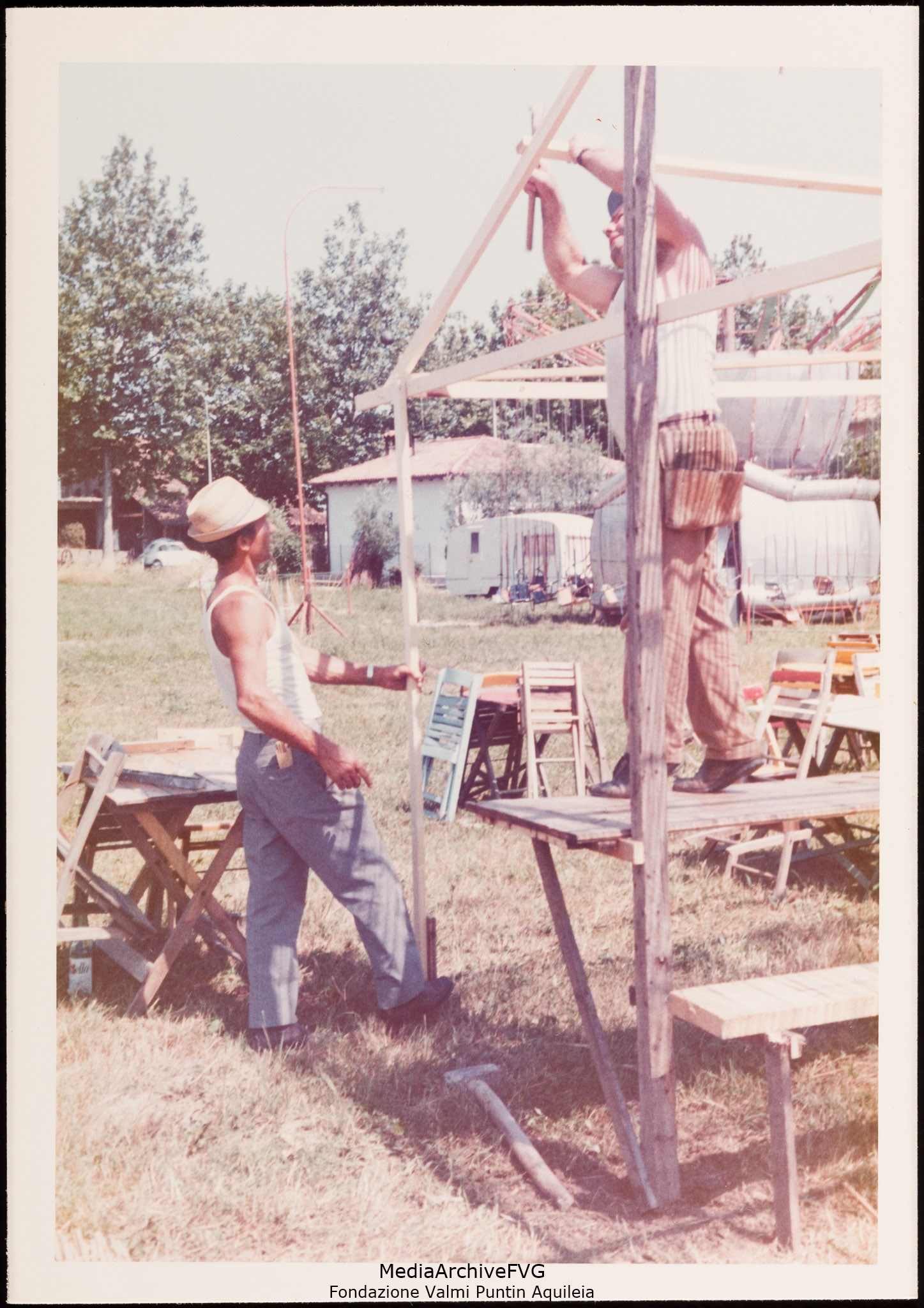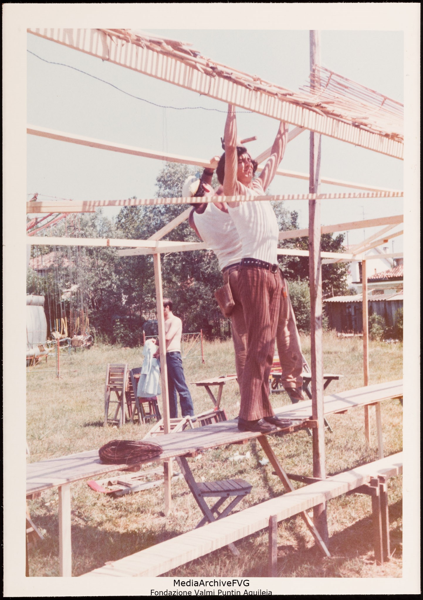 Festa o festival dell’Unità ad Aquileia. Due volontari costruiscono i chioschi