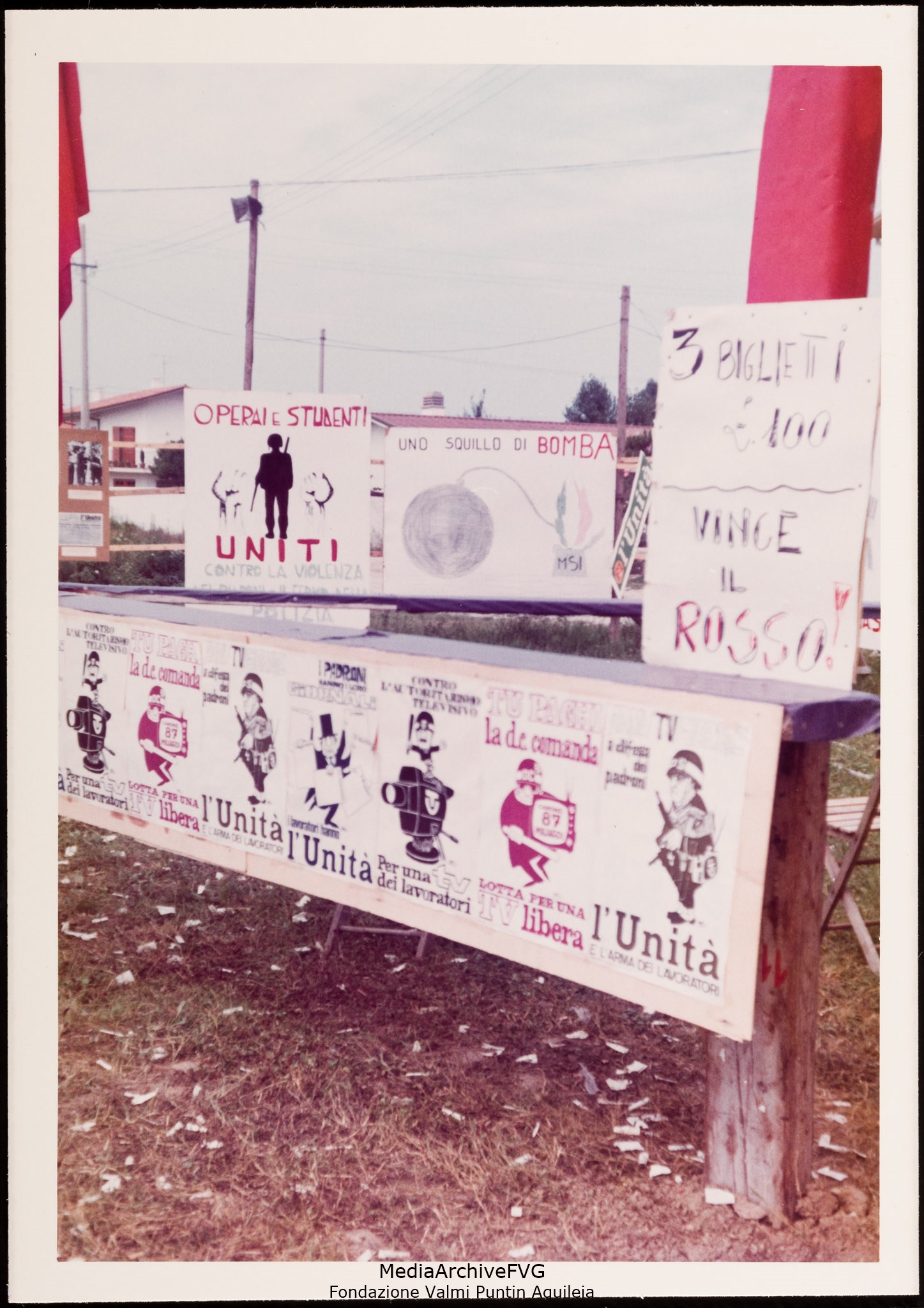 Festa o festival dell’Unità ad Aquileia. Cartelloni lungo il perimetro della festa