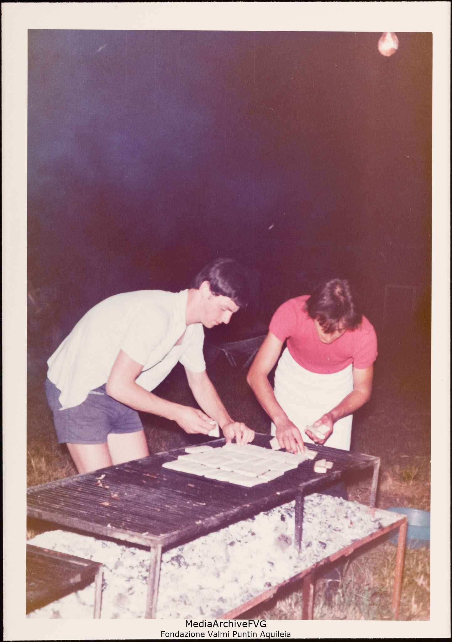 Festa o festival dell’Unità ad Aquileia. Due volontari preparano sulla griglia la polenta da arrostire