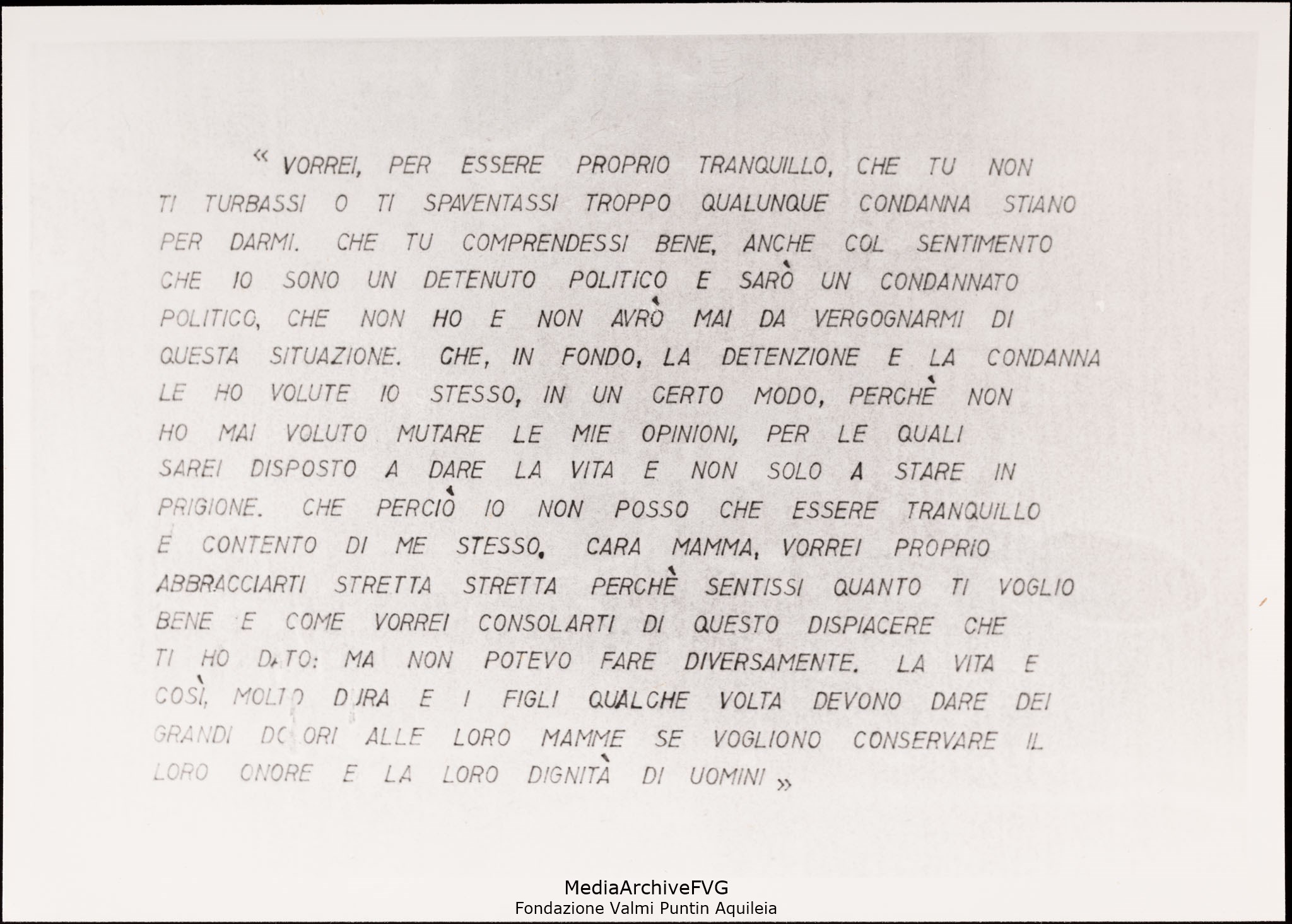Festa o festival dell’Unità ad Aquileia. Una mostra dedicata ad Antonio Gramsci in occasione del 40° anniversario della sua morte realizzata dalle ragazze e dai ragazzi della FGCI, con l’aiuto di Tullio Tentor. Pannello 9 (Lettera al figlio Delio)