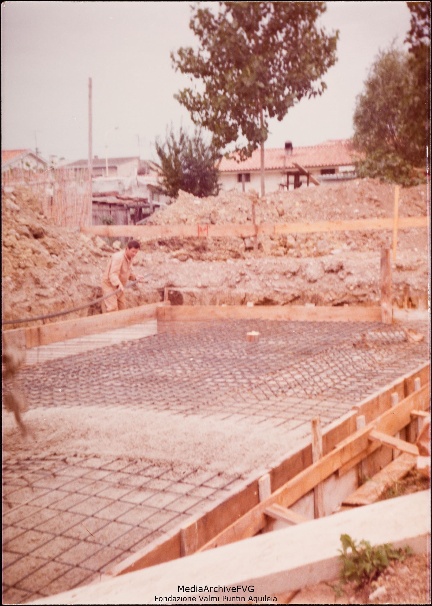 Edificazione della Casa del Popolo di Aquileia. Ferrante Nocent segue la colata di cemento durante il lavoro per il getto del solaio della cantina. Con lui Lucio Dambrosi