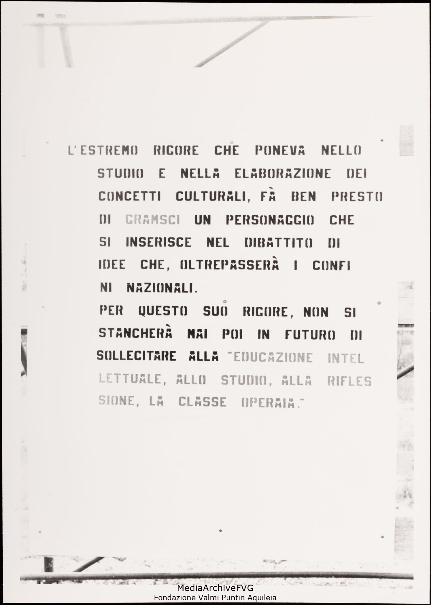 Festa o festival dell’Unità ad Aquileia. Una mostra dedicata ad Antonio Gramsci in occasione del 40° anniversario della sua morte realizzata dalle ragazze e dai ragazzi della FGCI, con l’aiuto di Tullio Tentor. Pannello 2