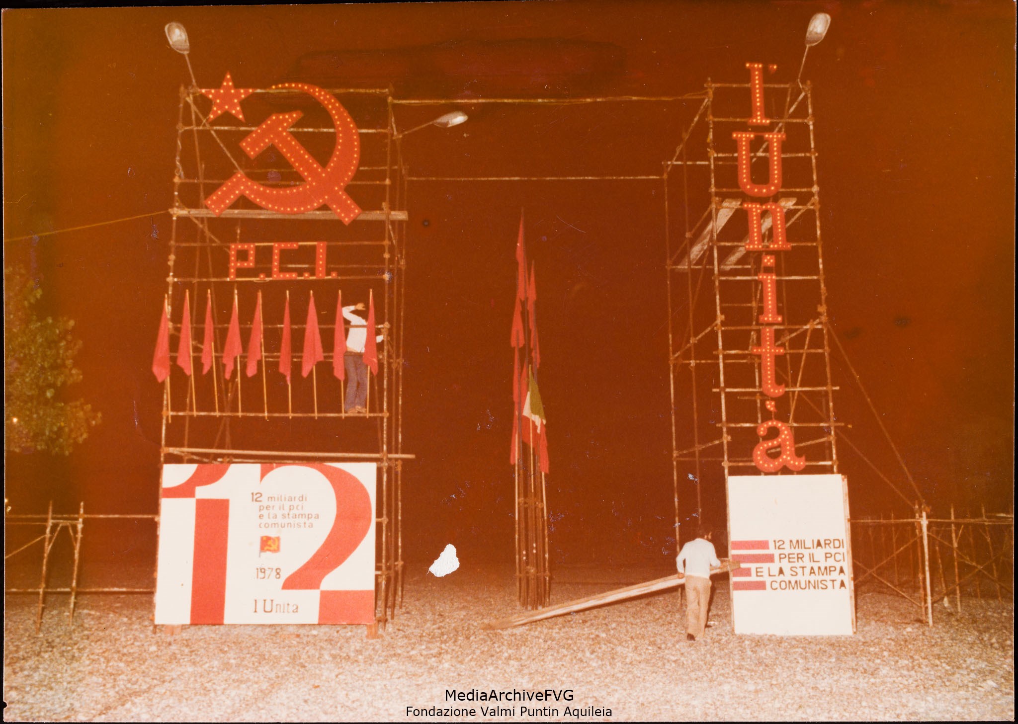 Festa o festival dell’Unità ad Aquileia. Allestimento dell’ingresso alla festa