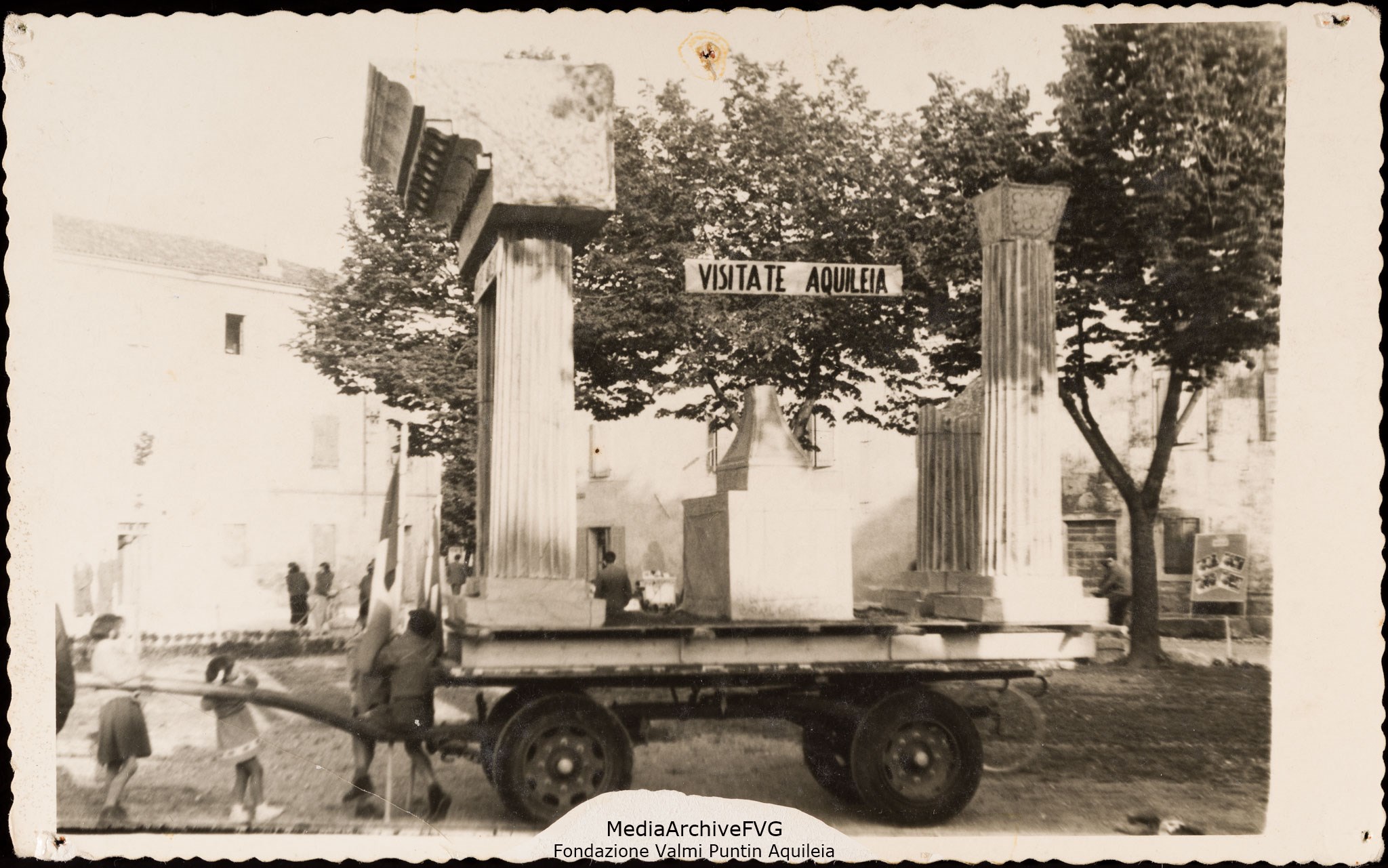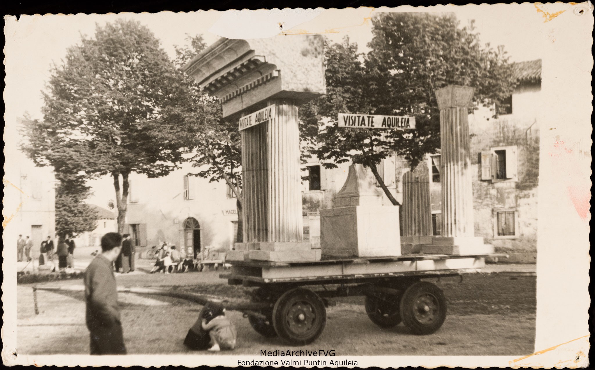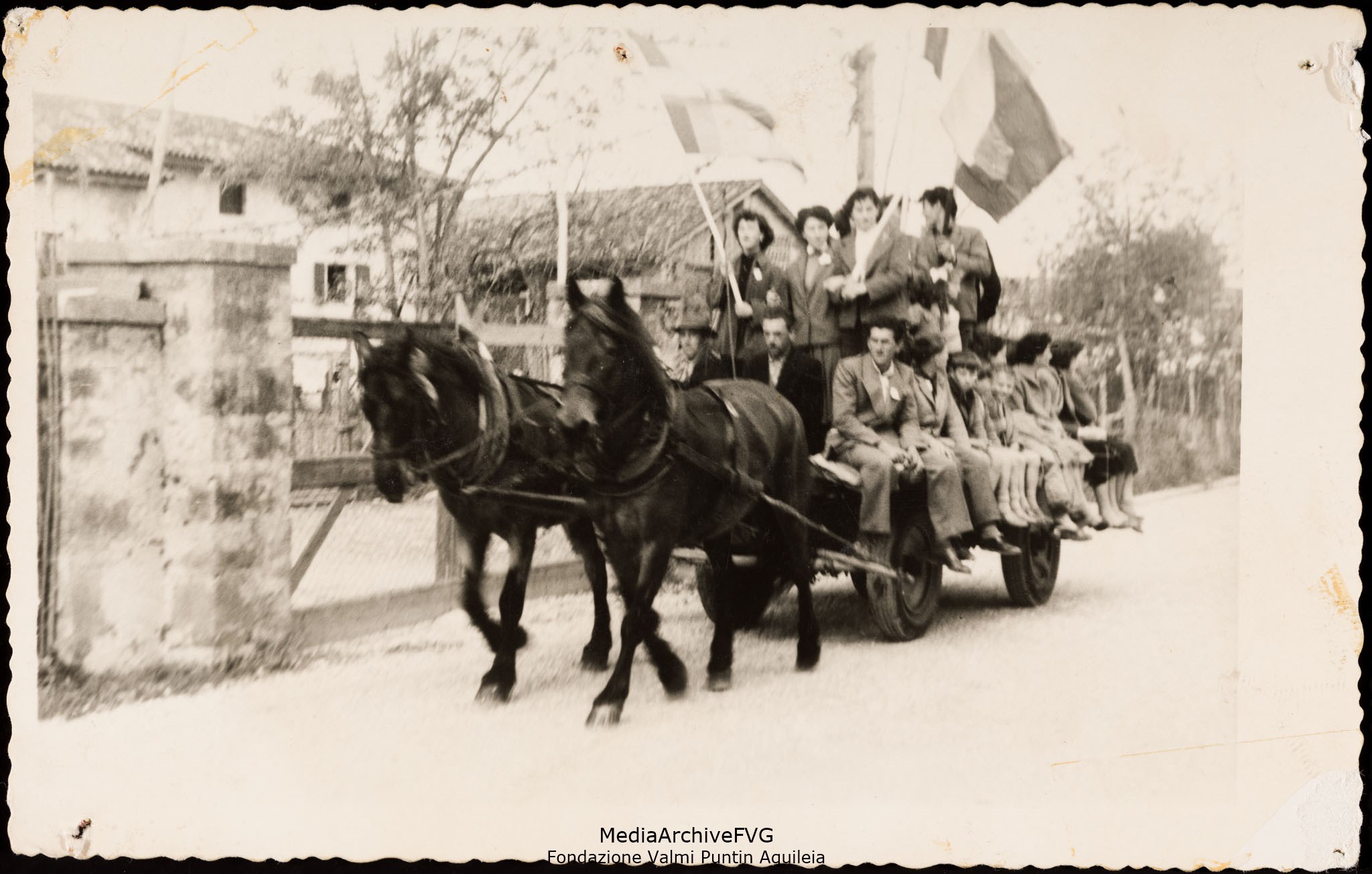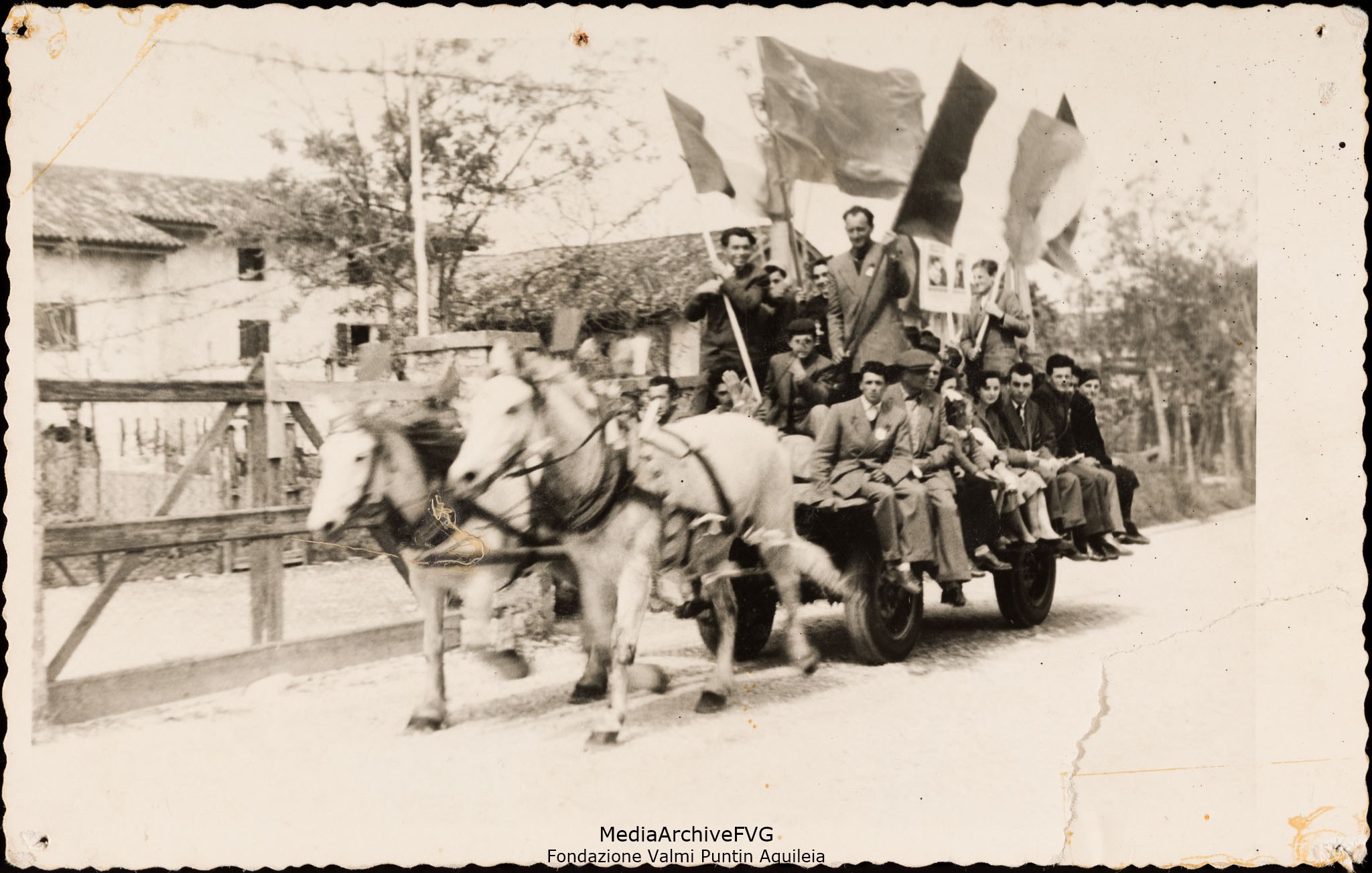 Festa del 1° maggio di Cervignano del Friuli. Carri trainati da cavalli trasportano i manifestanti di Aquileia