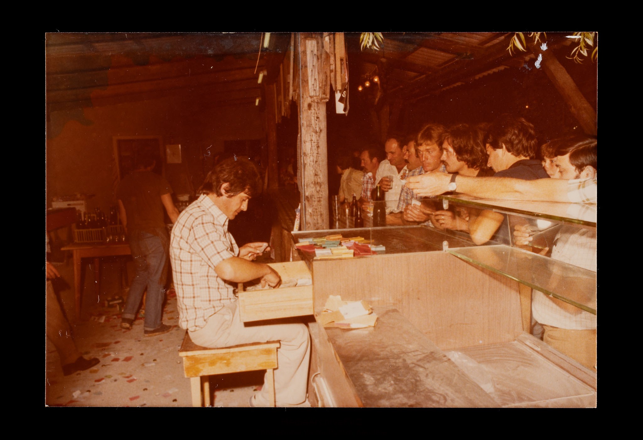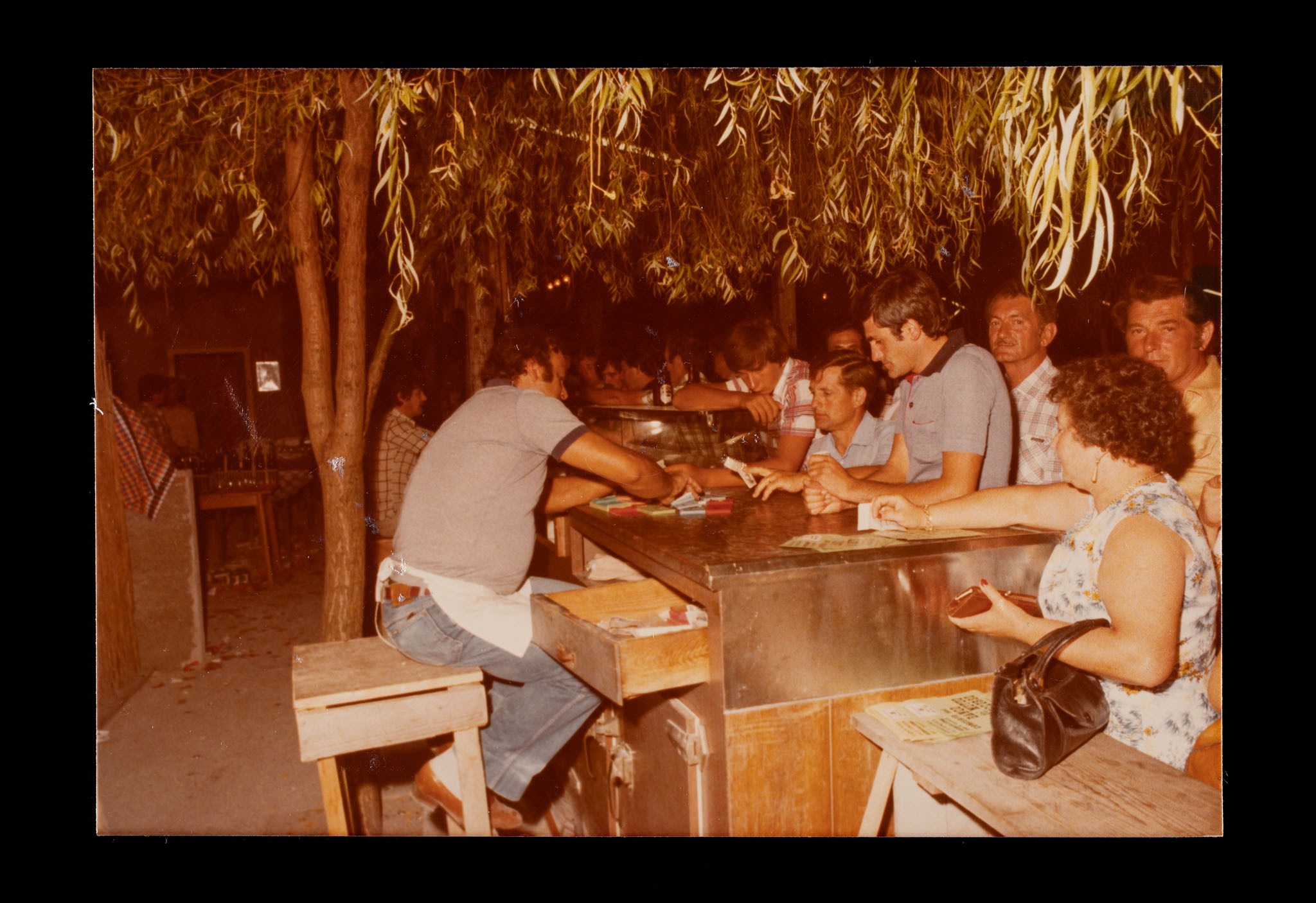 Festa o festival dell’Unità ad Aquileia. Partecipanti presso la cassa di un chiosco