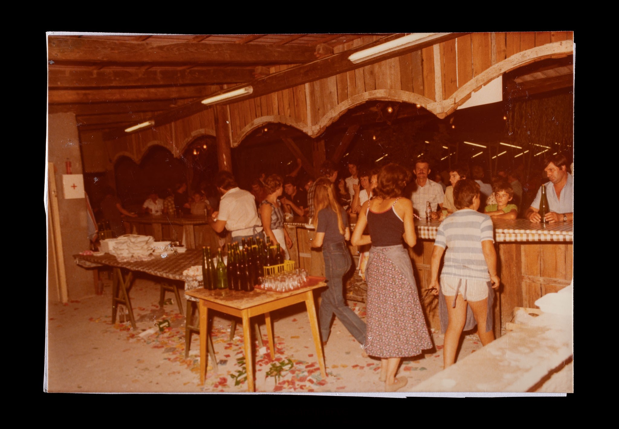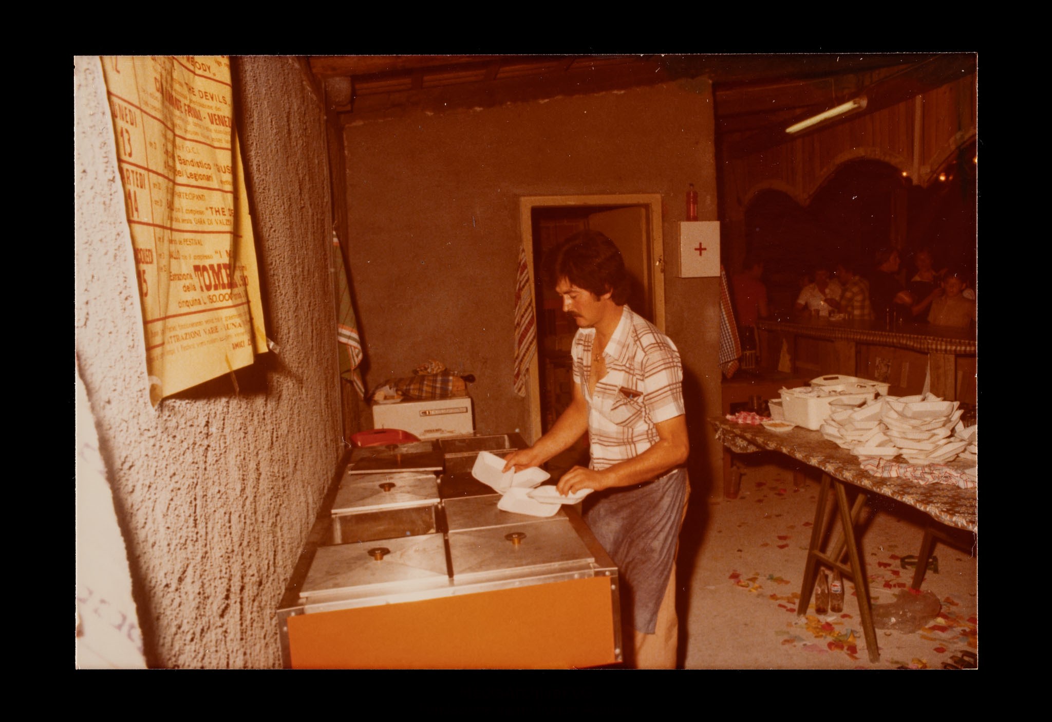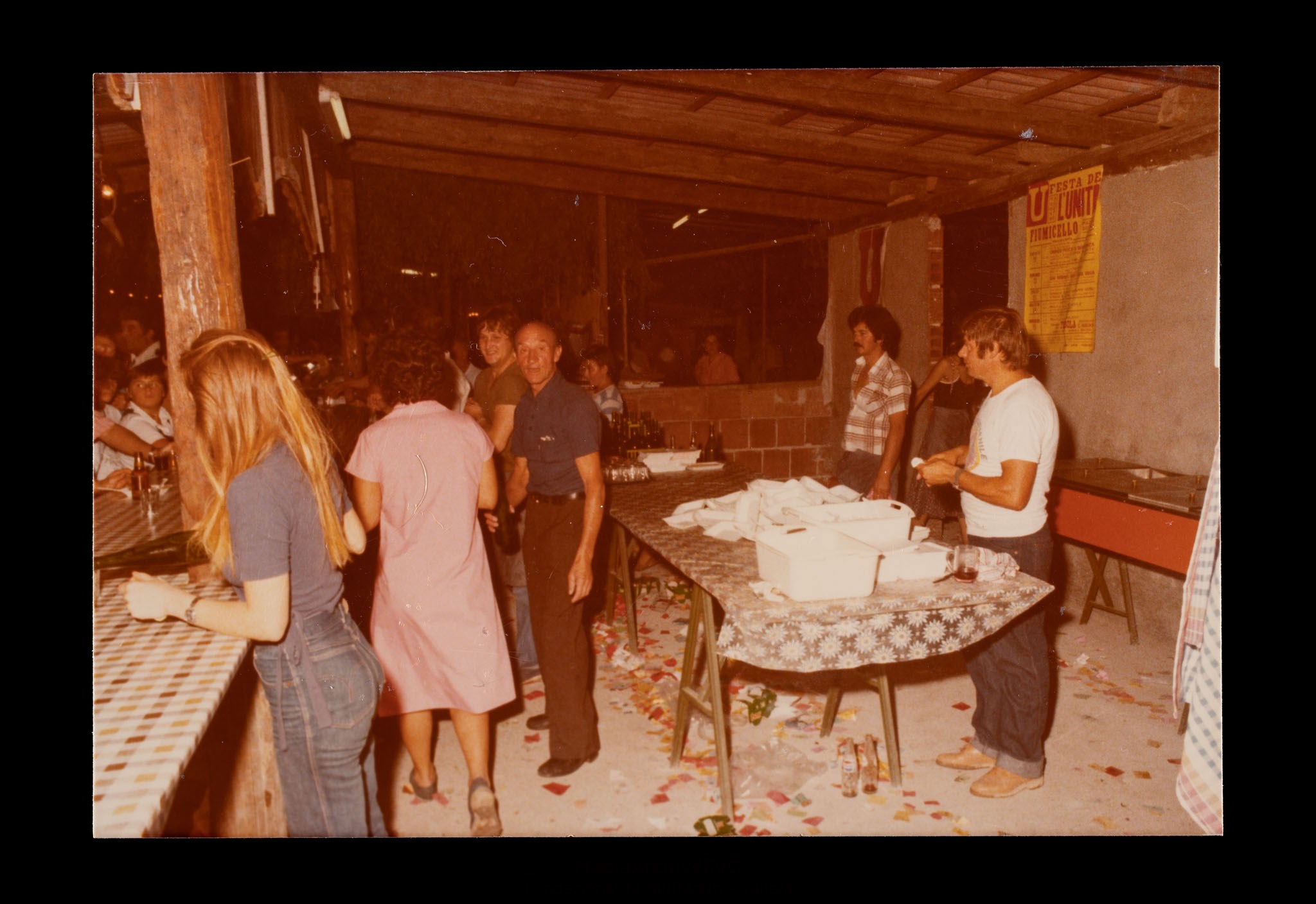 Festa o festival dell’Unità ad Aquileia. Gruppo di volontari dentro a un chiosco
