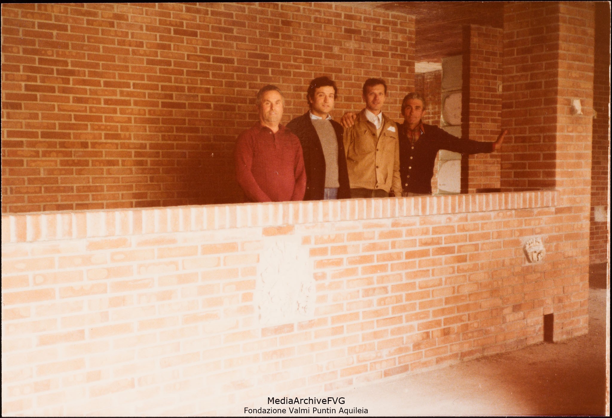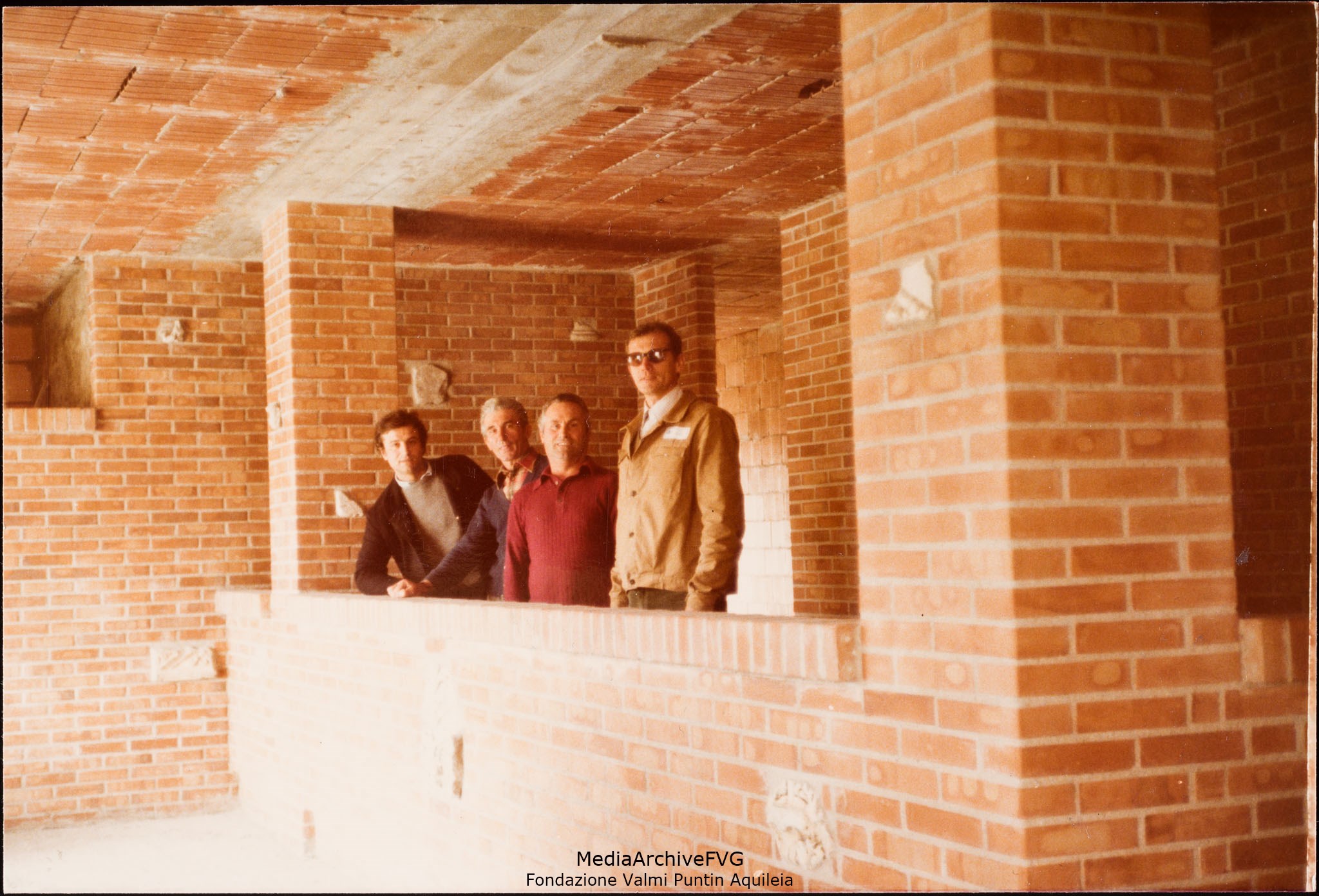 Edificazione della Casa del Popolo di Aquileia. Foto ricordo di alcuni volontari con il progettista dietro al bancone del bar finito