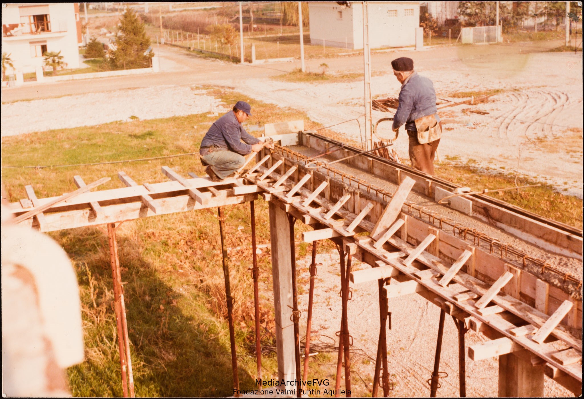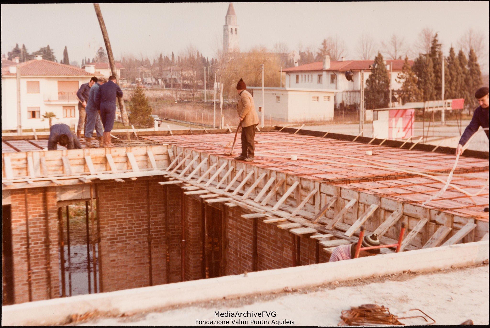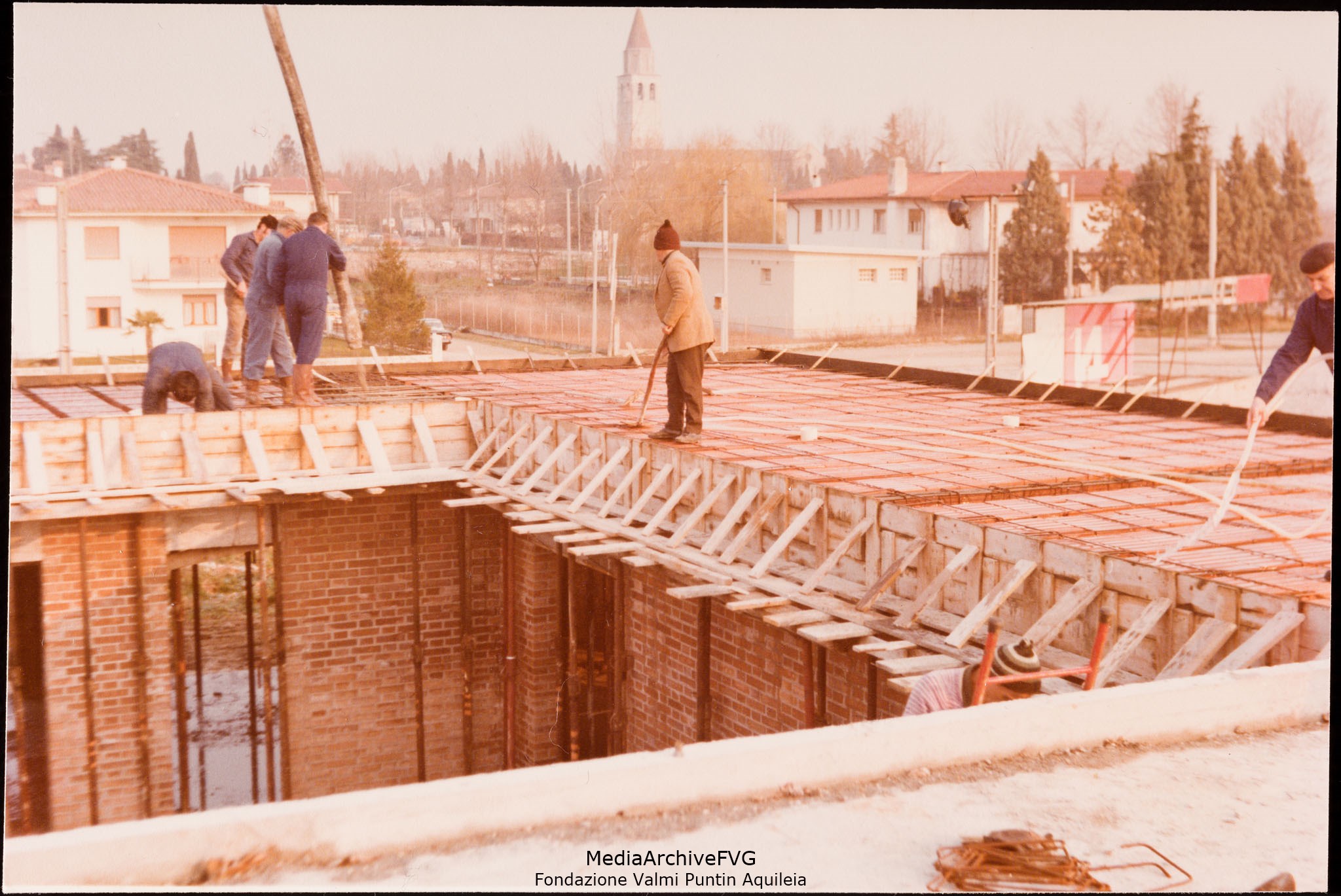 Edificazione della Casa del Popolo di Aquileia. Lavori di preparazione per il getto di calcestruzzo dell’architrave per la costruzione del patio interno