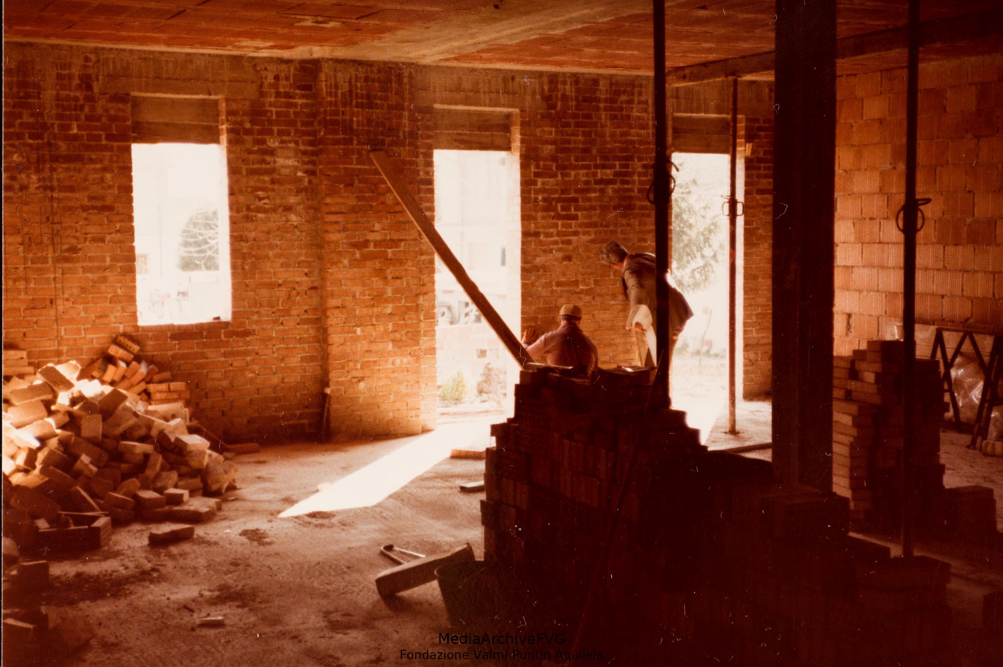 Edificazione della Casa del Popolo di Aquileia. Lavori all’interno dell’edificio. La costruzione delle pareti dei locali di servizio