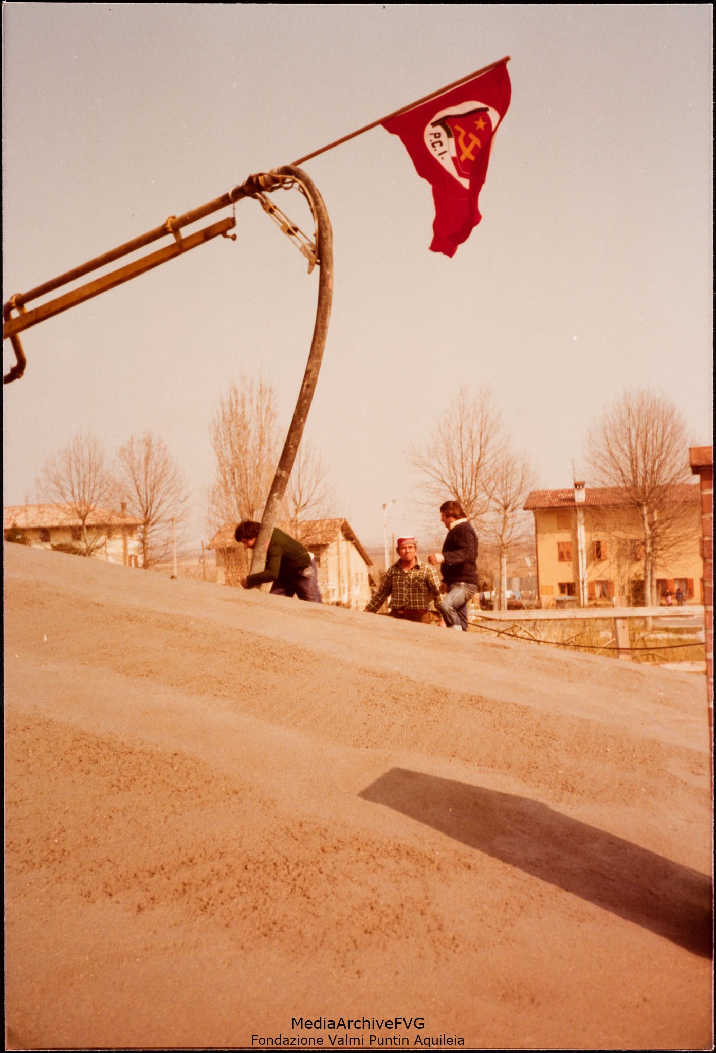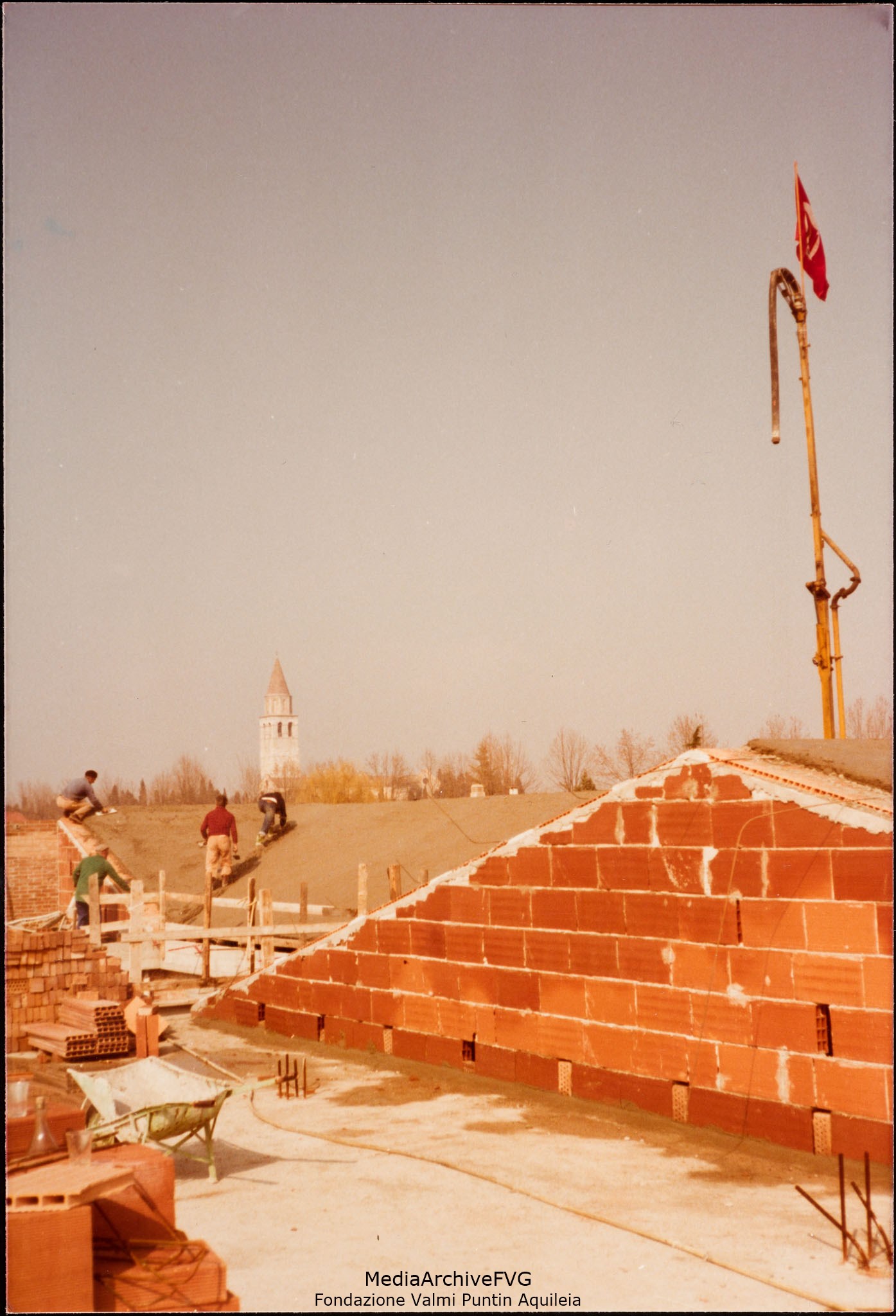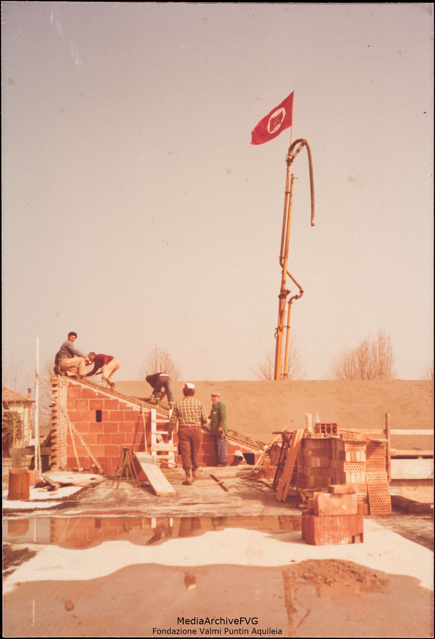 Edificazione della Casa del Popolo di Aquileia. Lavori sul tetto. La bandiera rossa con il simbolo del PCI sventola sul braccio della autobetoniera
