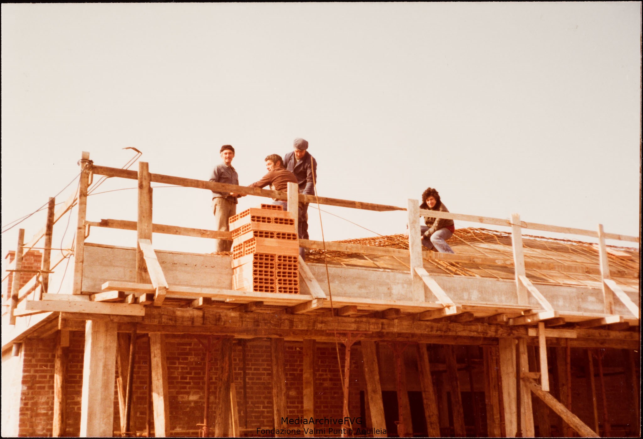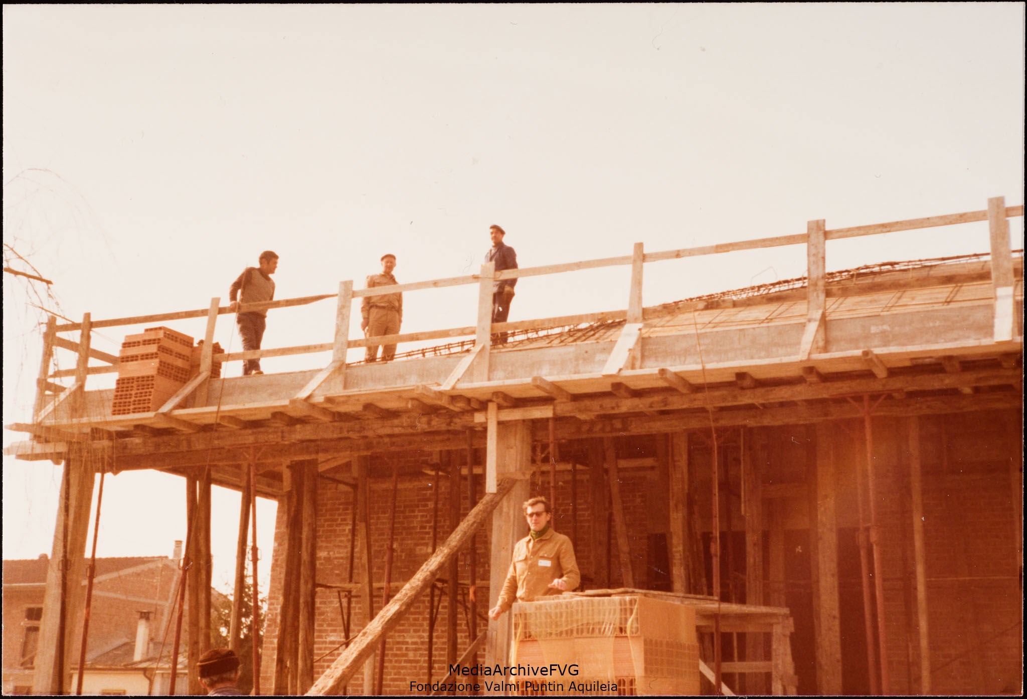 Edificazione della Casa del Popolo di Aquileia. Volontari stendono il calcestruzzo sul tetto