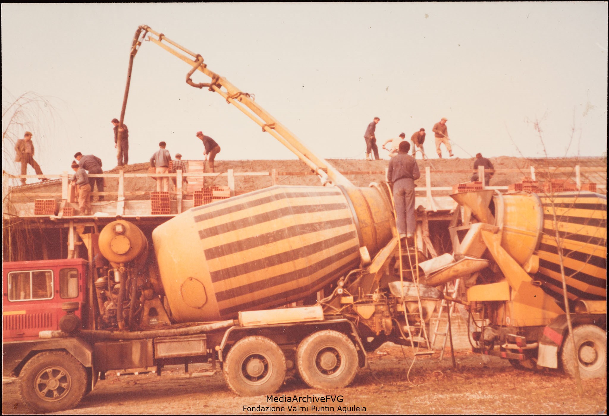 Edificazione della Casa del Popolo di Aquileia. Autobetoniere per il getto di calcestruzzo sul solaio del tetto