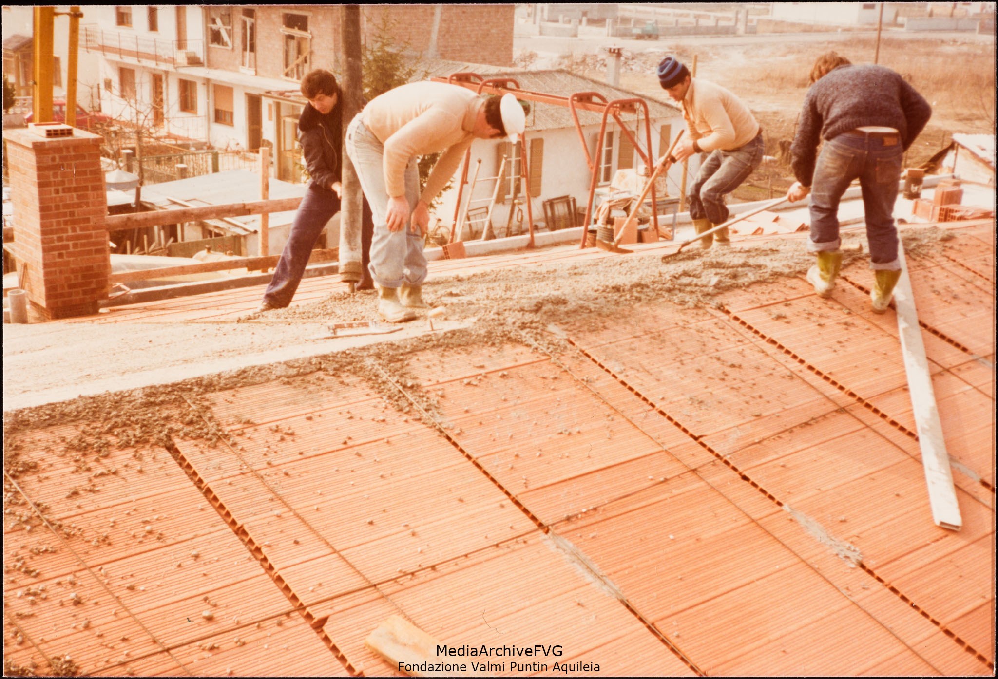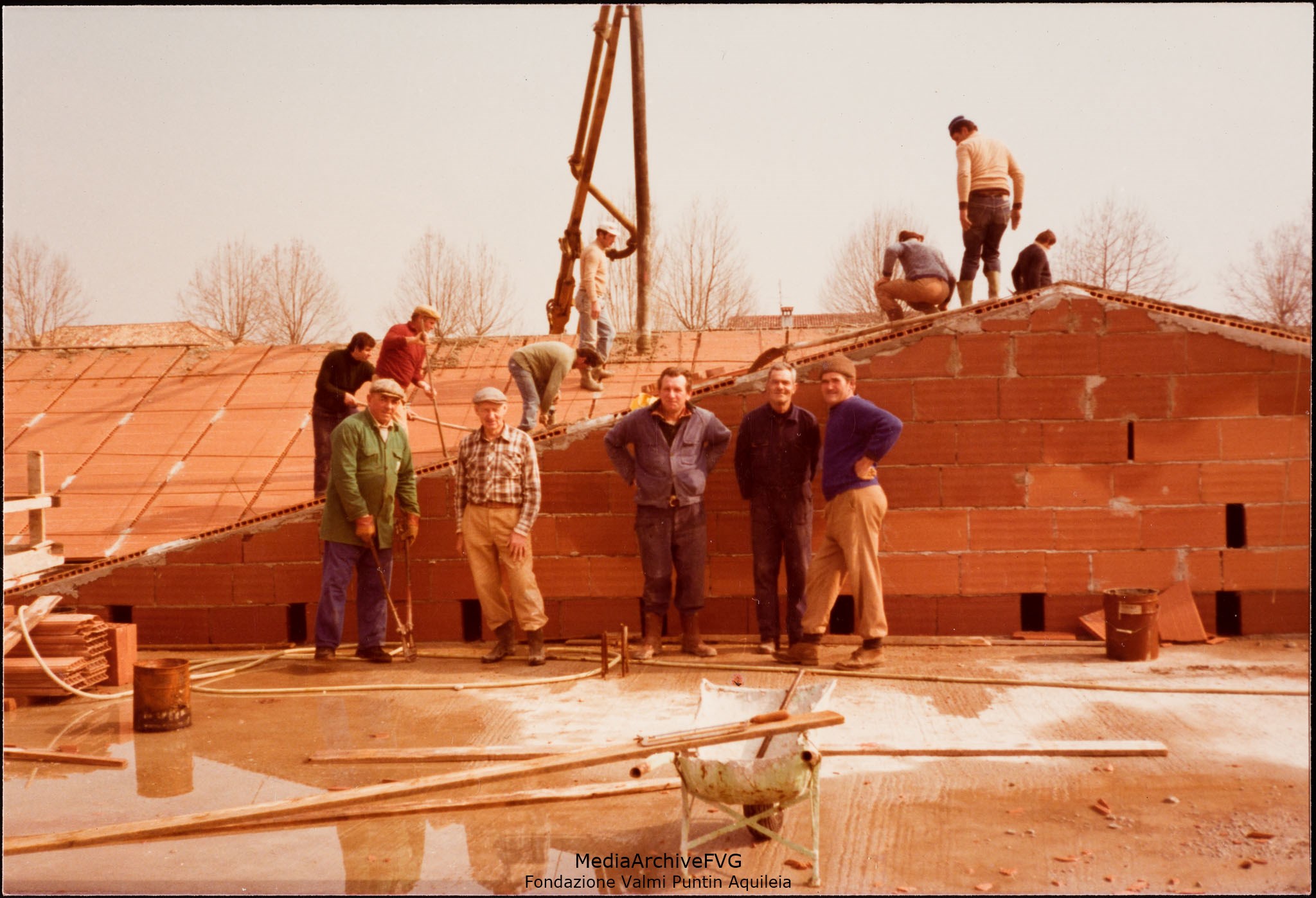 Edificazione della Casa del Popolo di Aquileia. Volontari al lavoro su una falda del tetto durante la colata del getto di calcestruzzo