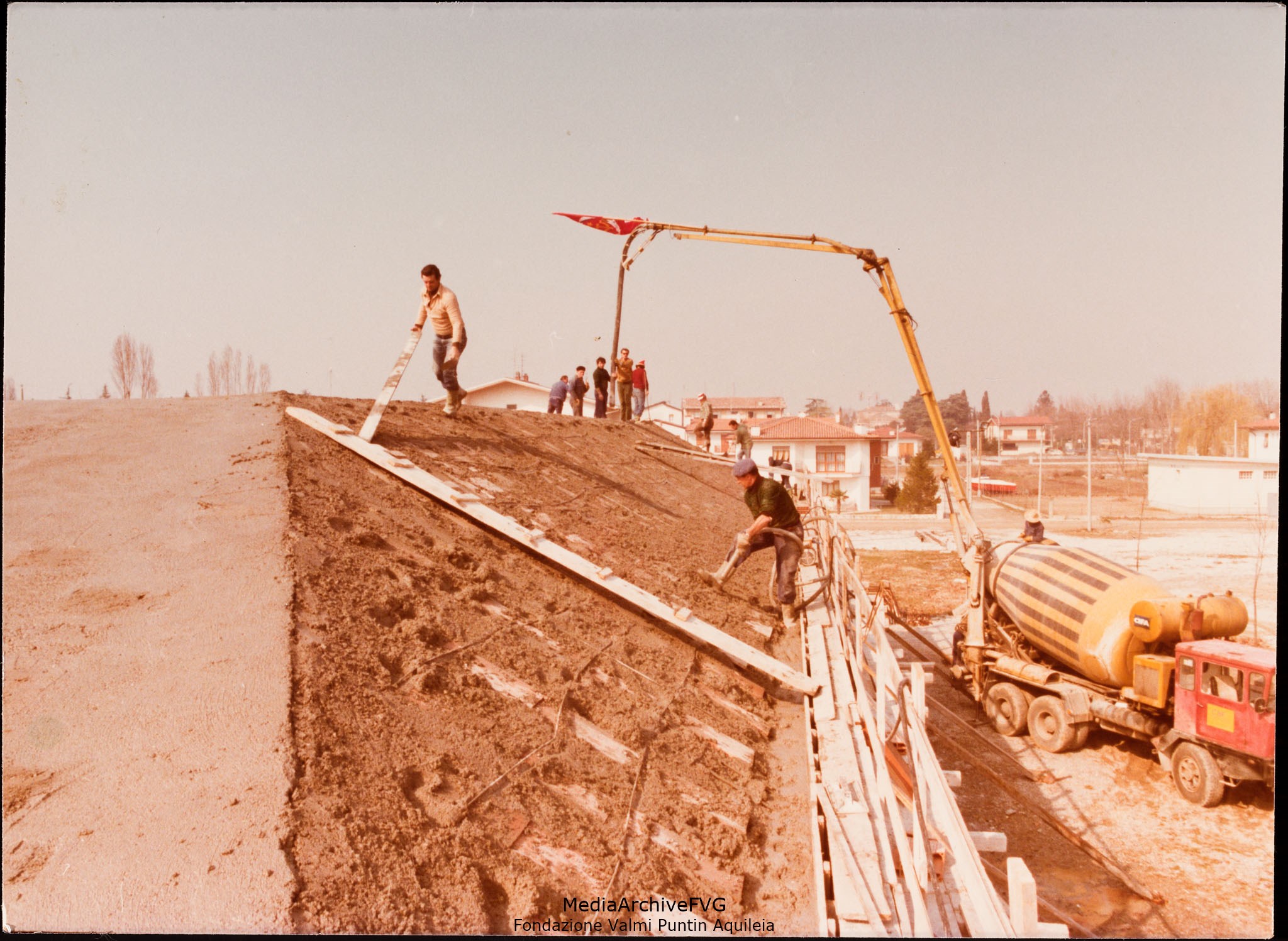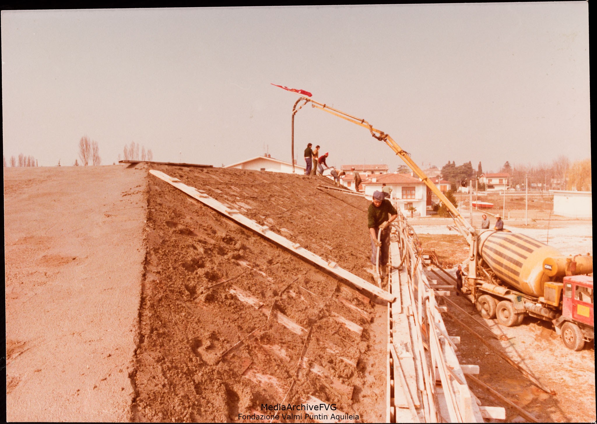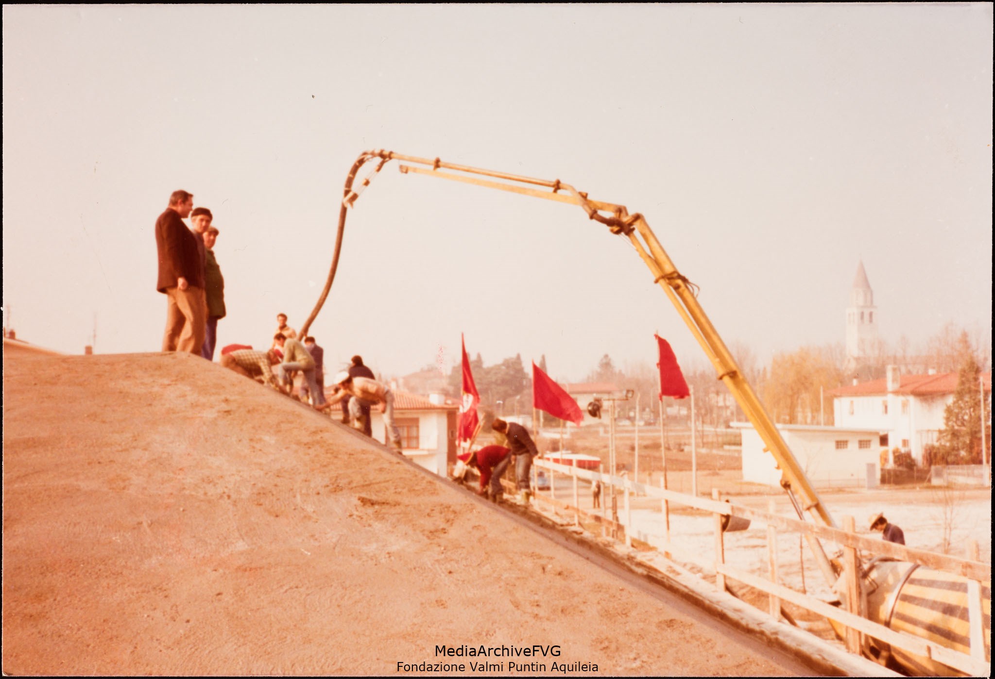 Edificazione della Casa del Popolo di Aquileia. Colata e stesura del calcestruzzo sul tetto