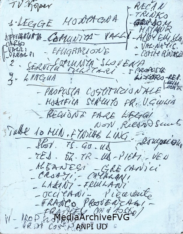 L'utilizzo della fotografia è stato gentilmente concesso da Luciano Lizzero. Sul verso della fotografia sono annotati anche gli argomenti trattati durante la trasmissione televisiva
