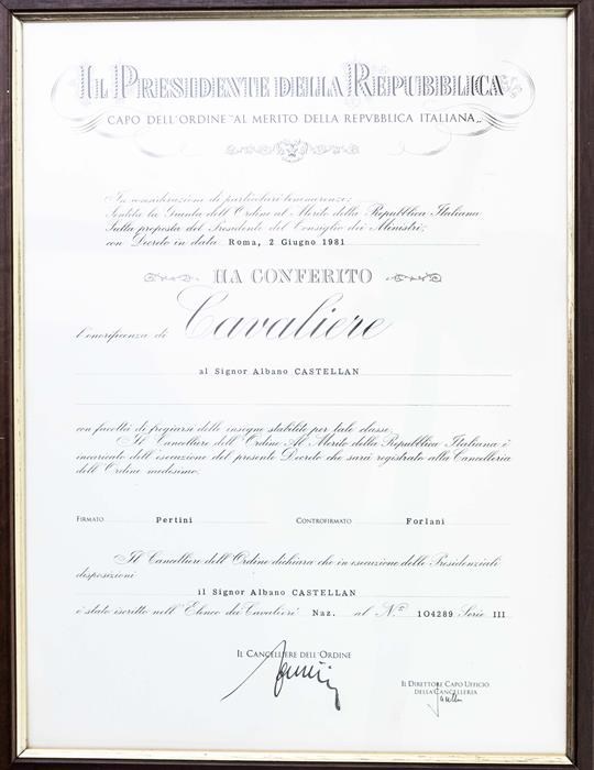Diploma concessione cavalierato Ordine al Merito della Repubblica