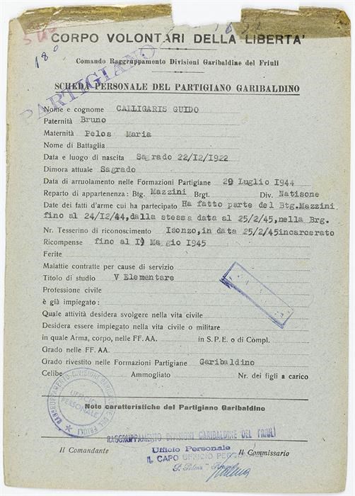 Ha fatto parte del Btg. Mazzini fino al 24/12/44, dalla stessa data al 25/2/45, nella Brg. Isonzo, in data 25/2/45 incarcerato fino al 19 maggio 1945