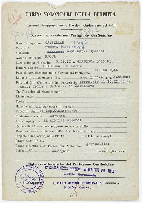 arrestato il 15.11.45 da parte della C.C.N.N. di Palmanova
